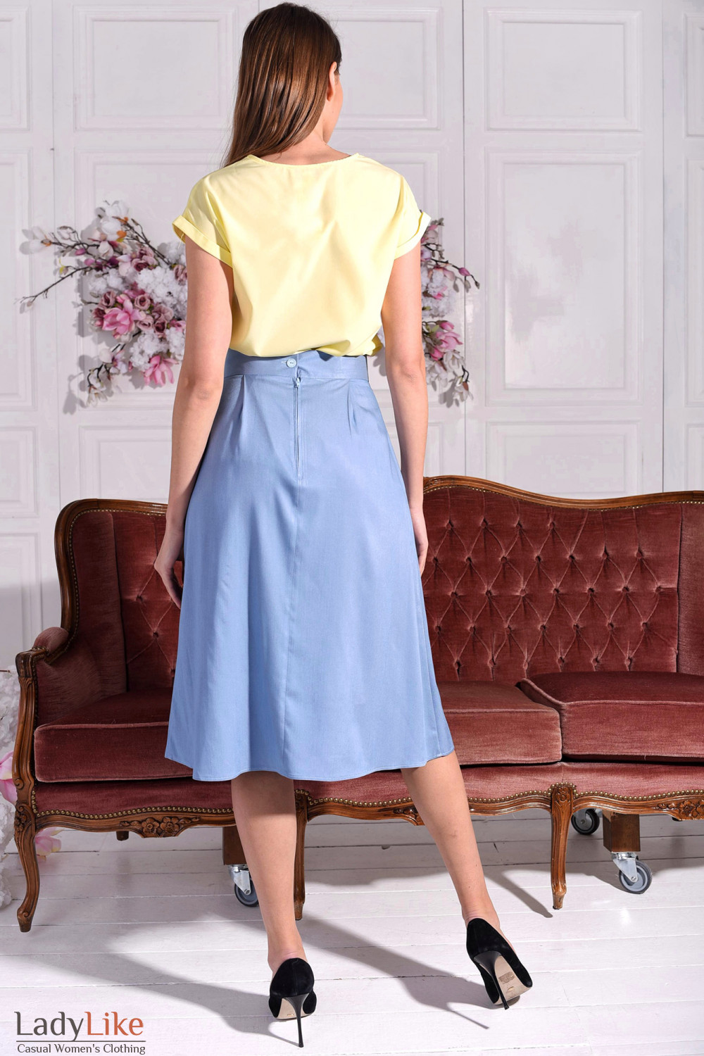 Просторная юбка голубого цвета. Без подкладки. Высокая посадка в талии, длина миди. Застегивается на молнию и пуговицу сзади. Длина около 75 см.