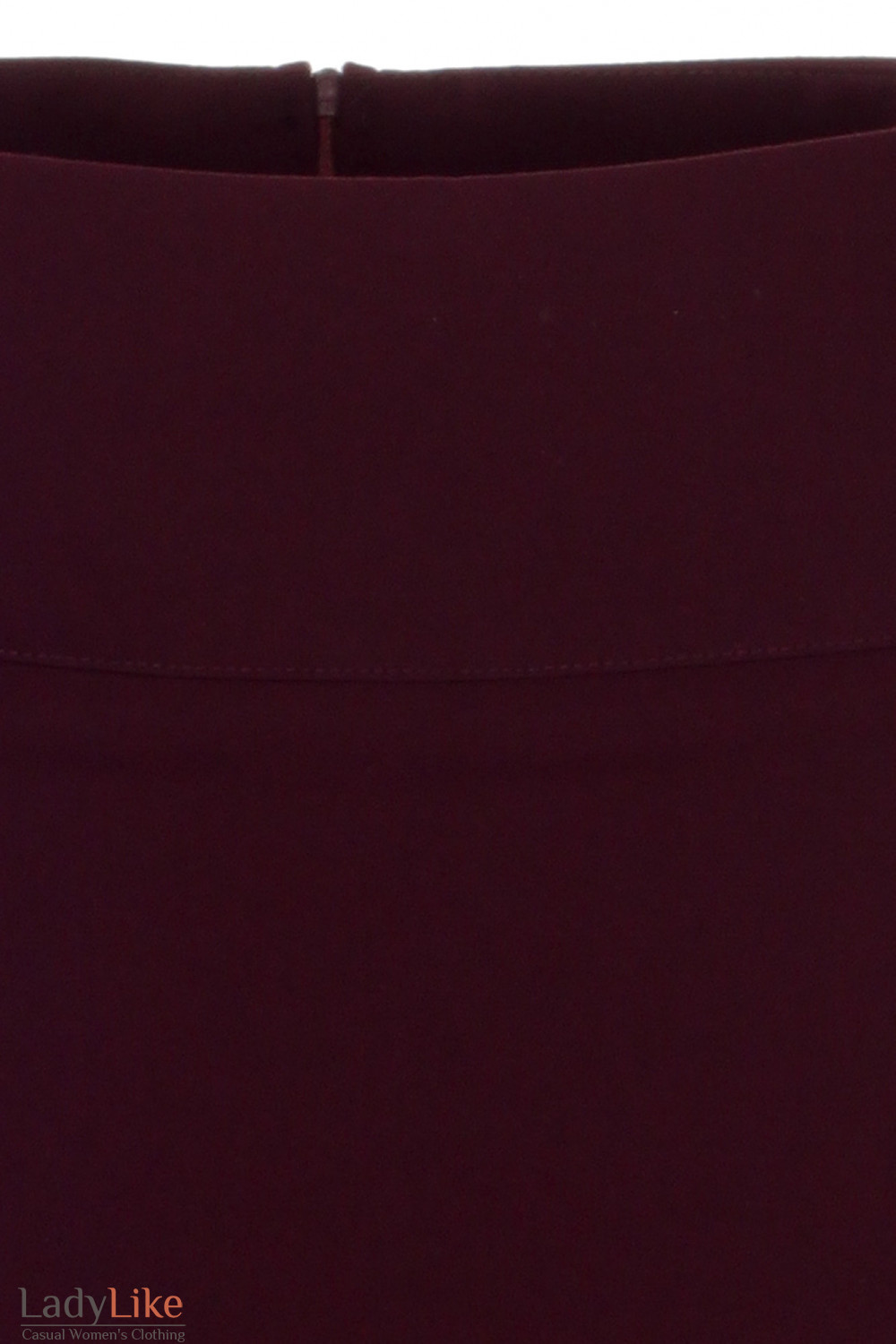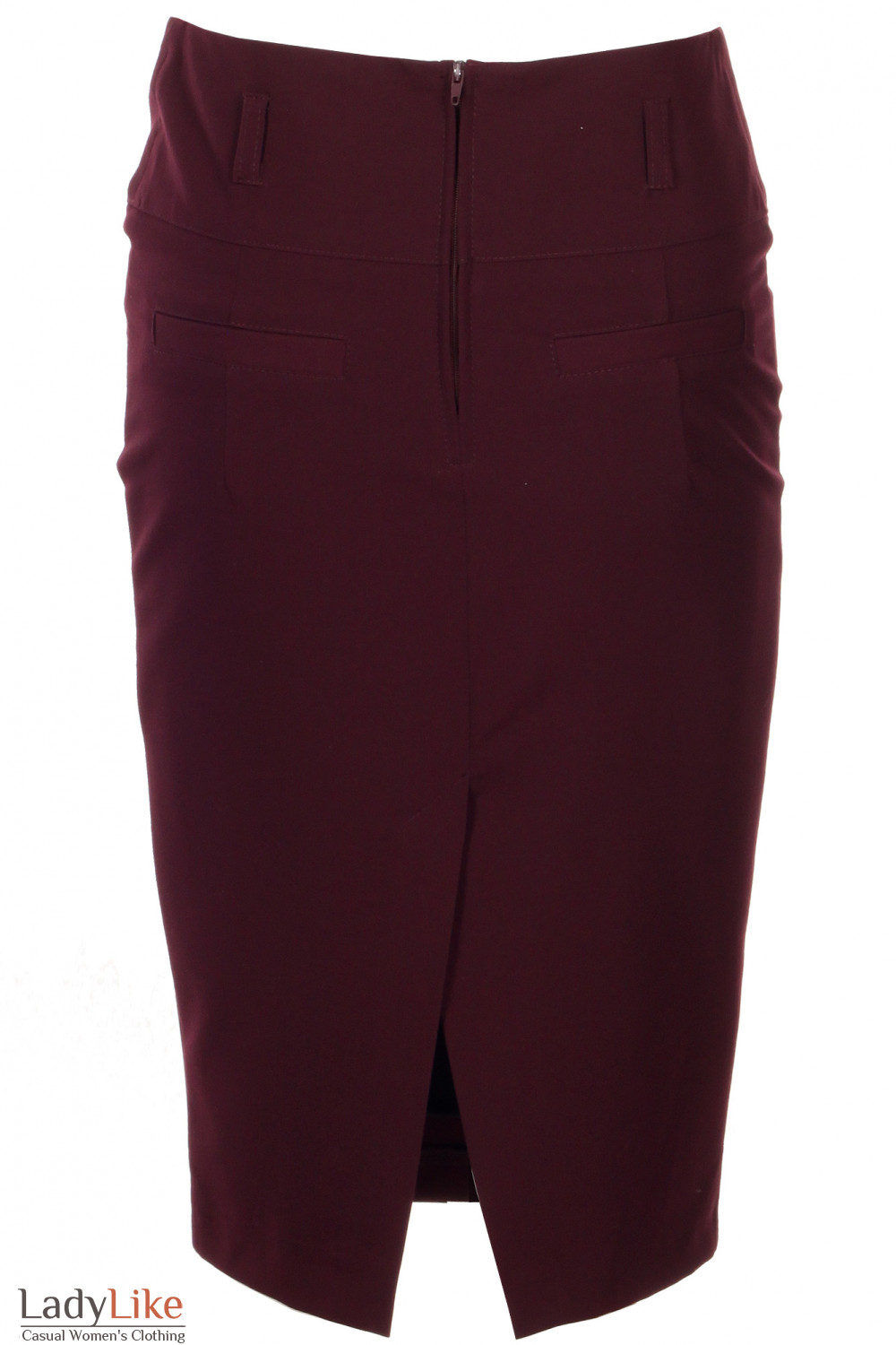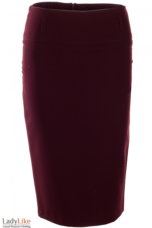 Юбка-карандаш зауженная к низу бордового цвета. Широкий пояс со шлевками. Сзади декоративные листочки. Косая шлица. Застежка на молнию сзади. Юбка на подкладке. Длина около 63 см.