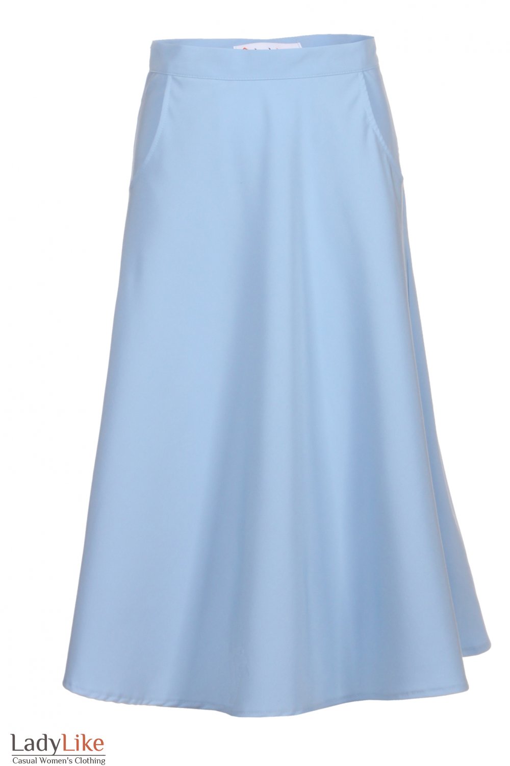 Юбка миди расклешенная голубого цвета. Высокая посадка в талии, сбоку застегивается на потайную молнию. Пояс втачной из основной ткани. По бокам карманы. Длина юбки 72см.
