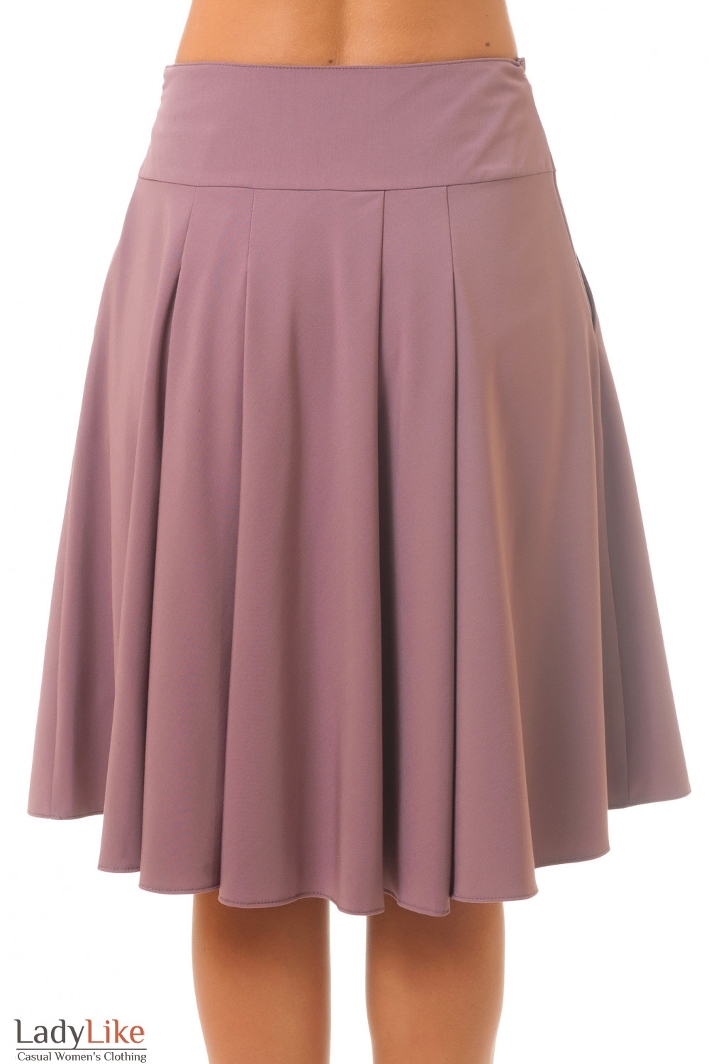 Сиреневая юбка-солнцеклеш. Широкая кокетка, средняя посадка. По бокам карманы. Впереди и сзади защипы. Застегивается на молнию сбоку. Длина ок. 55 см. Состав: 53% вискоза, 35% полиэстер, 10% хлопок, 2% эластан.