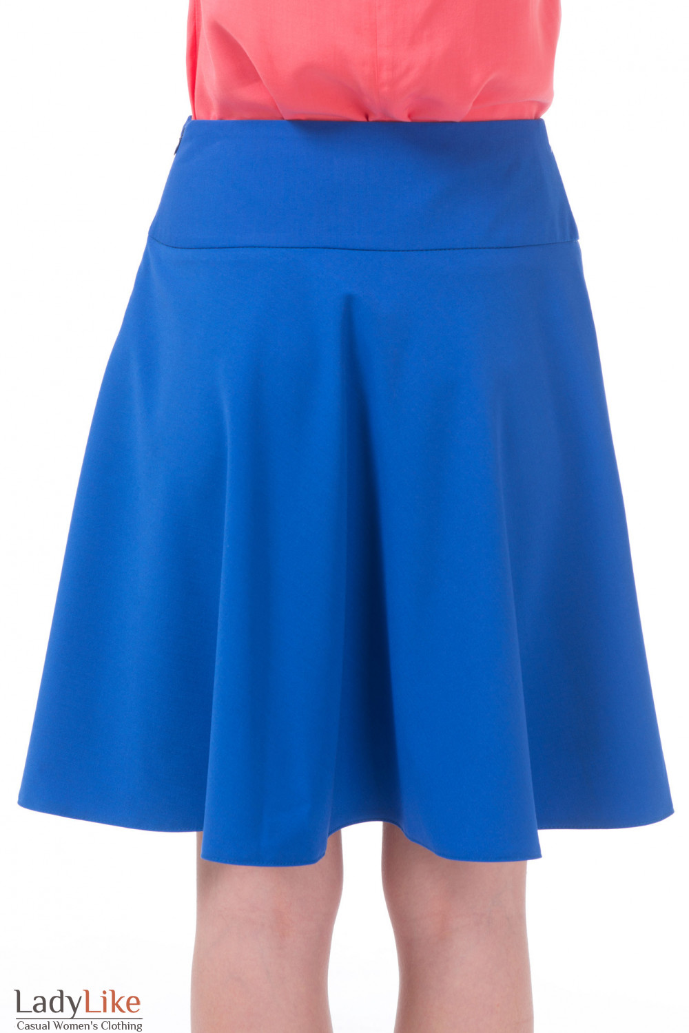 Ярко-синяя летняя юбка полусолнце. Широкая кокетка, средняя посадка на бедрах. По бокам карманы. Застегивается на потайную молнию сбоку. Длина ок. 56 см.