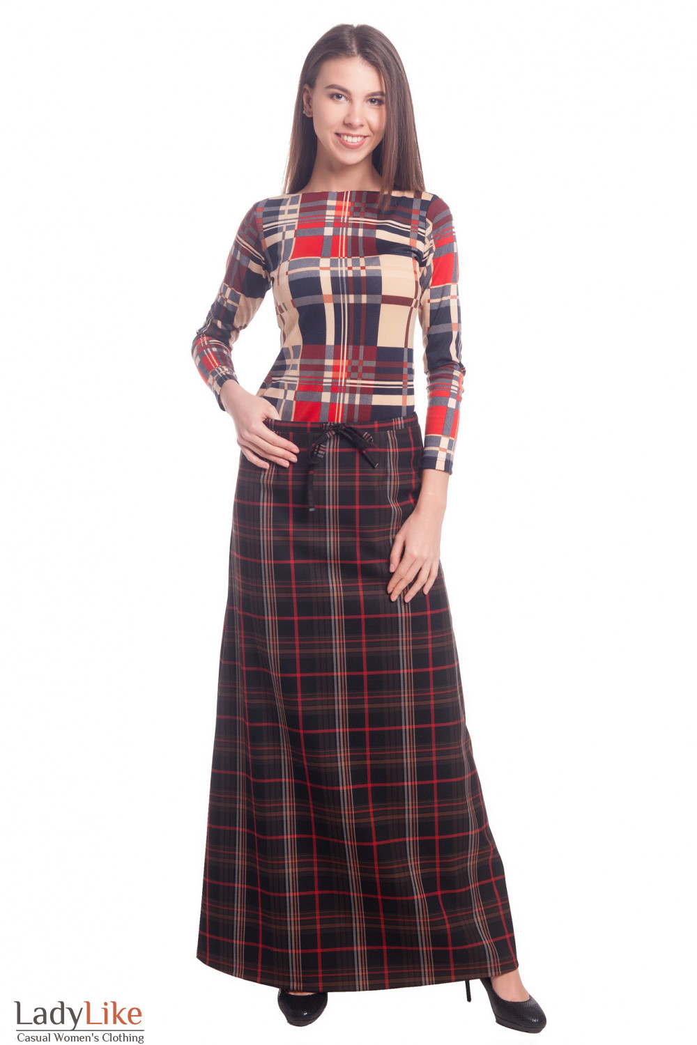 Юбка длинная теплая коричевого цвета в карасную клетку. Чуть заниженная талия. На поясе кулиска. Длина юбки ок. 98 см. На трикотажной подкладке.
