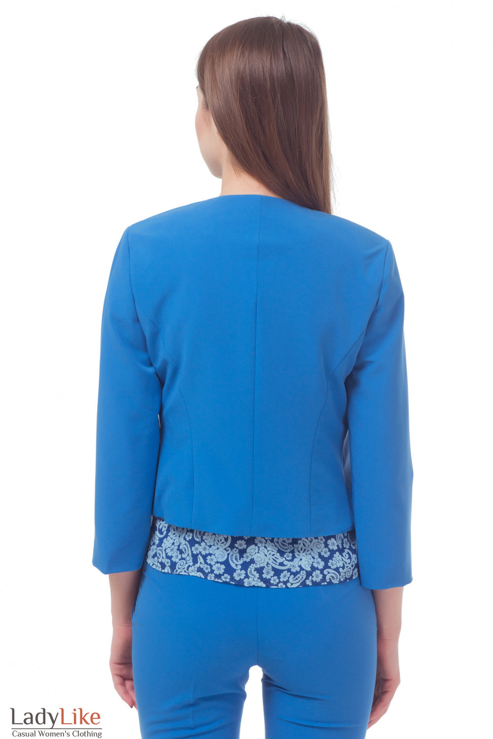 Элегантное голубое болеро. Стандартный короткий крой. Прямой рукав длиной в три четверти. Длина около 48 см.