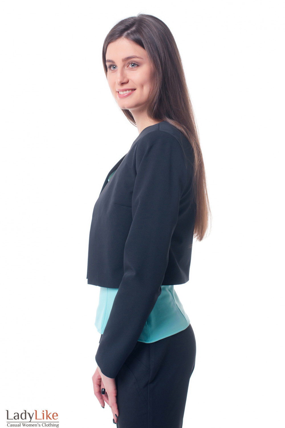 Черный короткий женский жакет. Без застежки. Прямой крой. Рукав длинный. На подкладке. Длина около 40 см.