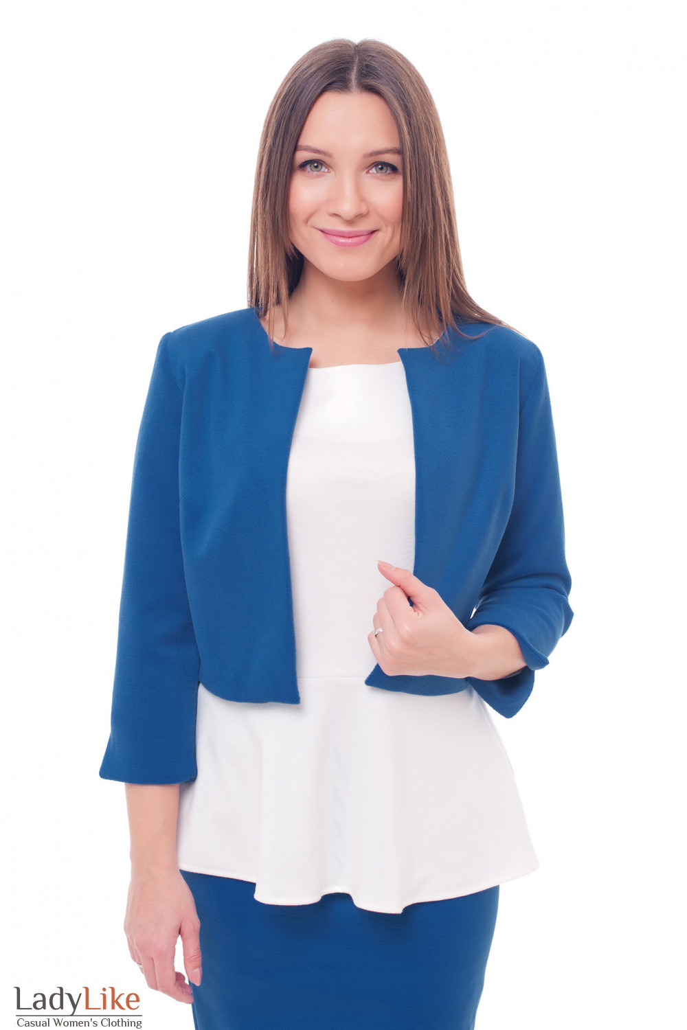 Яркий короткий женский жакет цвета электрик. Без застежки. Прямой крой. Рукав длиной в три четверти, украшен разрезом. На подкладке. Длина по спинке около 40 см.