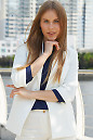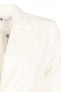 Жакет приталенный однобортный, белого цвета, с подкладкой, застегивается на одну пуговицу. Отложной воротник с заостренными лацканами. Впереди карманы с листочкой. Рукав три четверти с цельнокроеной отворотной манжетой. Длина 66 см.