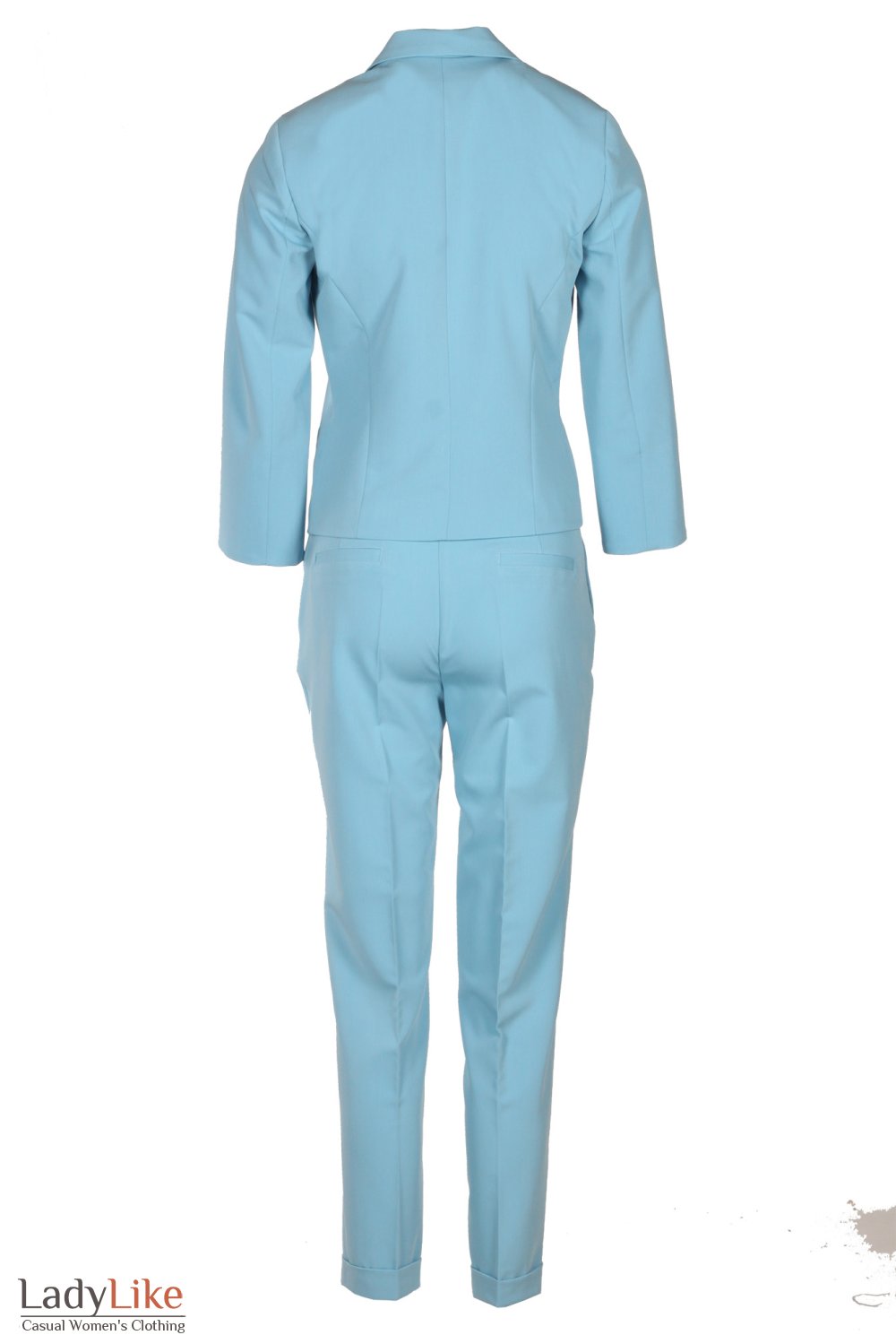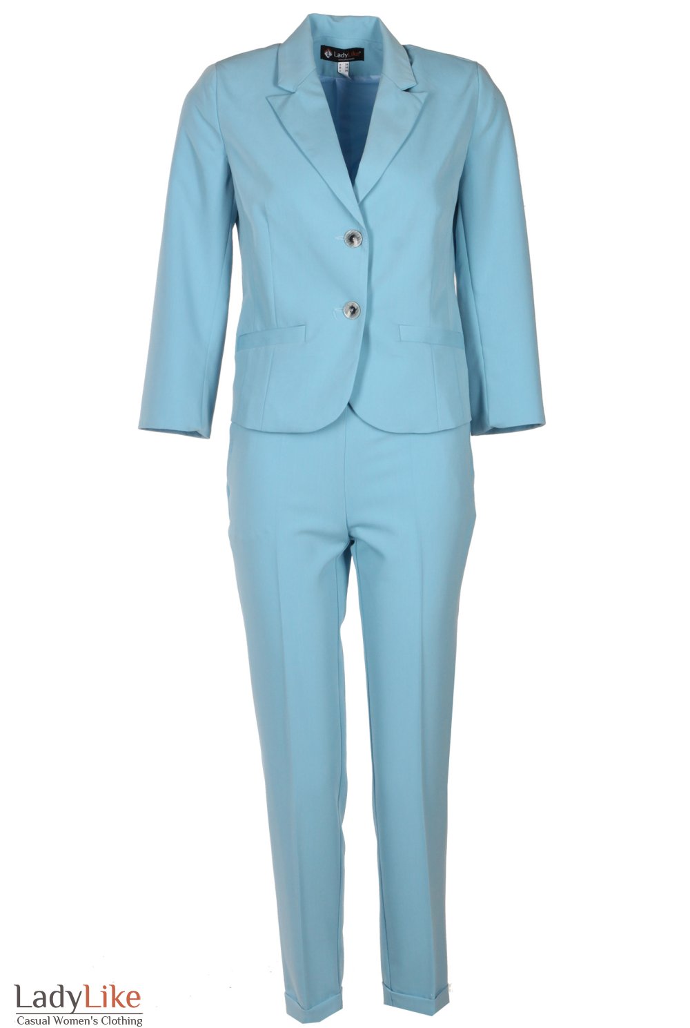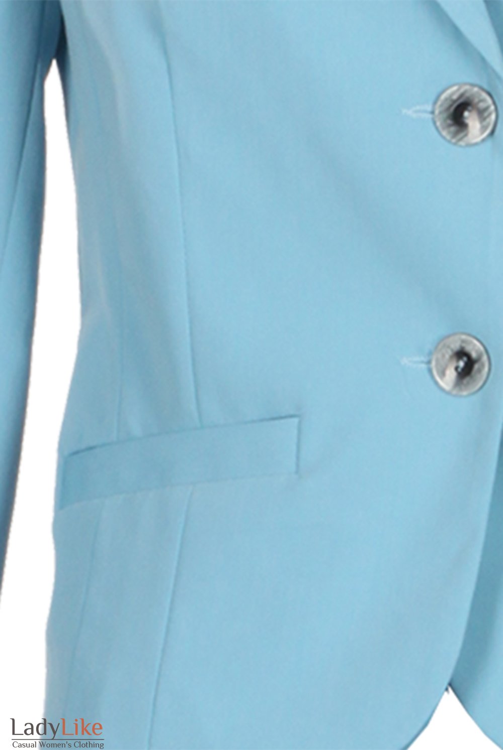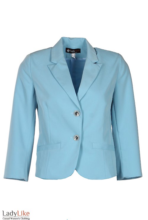 Жакет приталенного силуэта нежно голубого цвета. Английский воротник. Рукав длиной в три четверти с отворотной манжетой. На подкладке. Длина около 51 см.