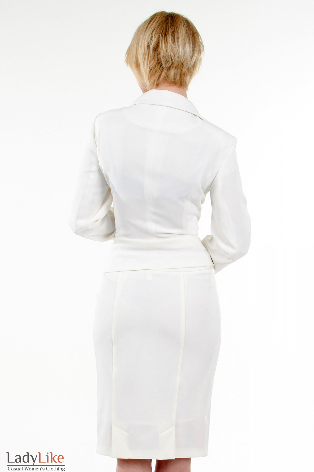 Изысканный белый жакет с круглым воротником в виде трёх складок. Приталённого кроя. Прорезные карманы. Застёжка на две пуговицы и две петли. Длина ок. 55см. Состав: 53% вискоза, 10% шерсть, 35% полиэстра, 2% эластана.