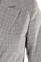 Удлиненный жакет серый в клетку. Приталенный силуэт. Английский воротник, рукав длиной в три четверти с манжетой. По бокам карманы с клапанами. Застежка на одну пуговицу с петлей. Длина около 80 см.