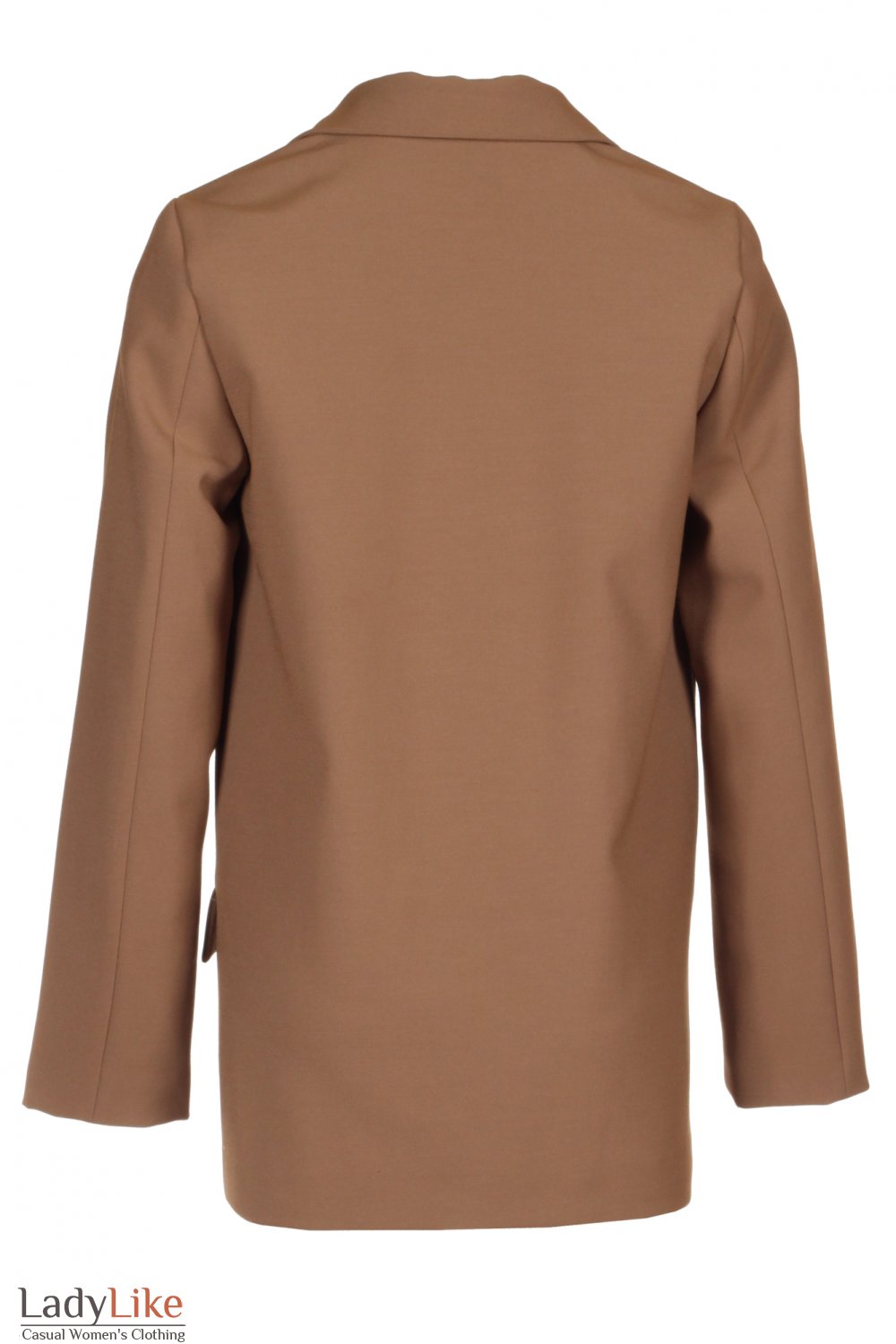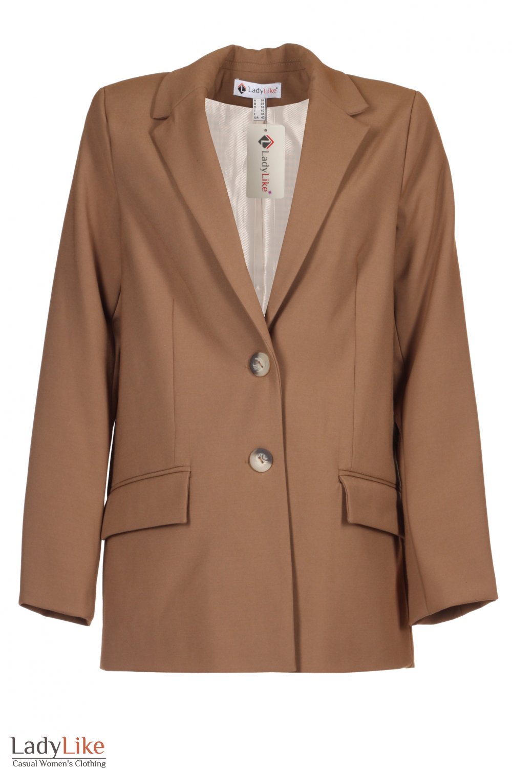 Удлиненный женский жакет оверсайз, с подкладкой, бежевого цвета. Однобортный, застегивается на две пуговицы. Рукава длинные. Английский отложной воротник с лацканами, впереди по бокам карманы с клапанами. Длина жакета 75см.