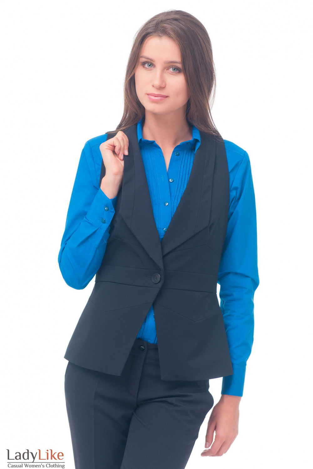 Жилетка черная удлиненная, приталенного силуэта. V-образный вырез украшен отложным воротником. Застегивается на одну пуговицу, украшена широким отрезным поясом. Жилетка на подкладке. Длина около 62 см.