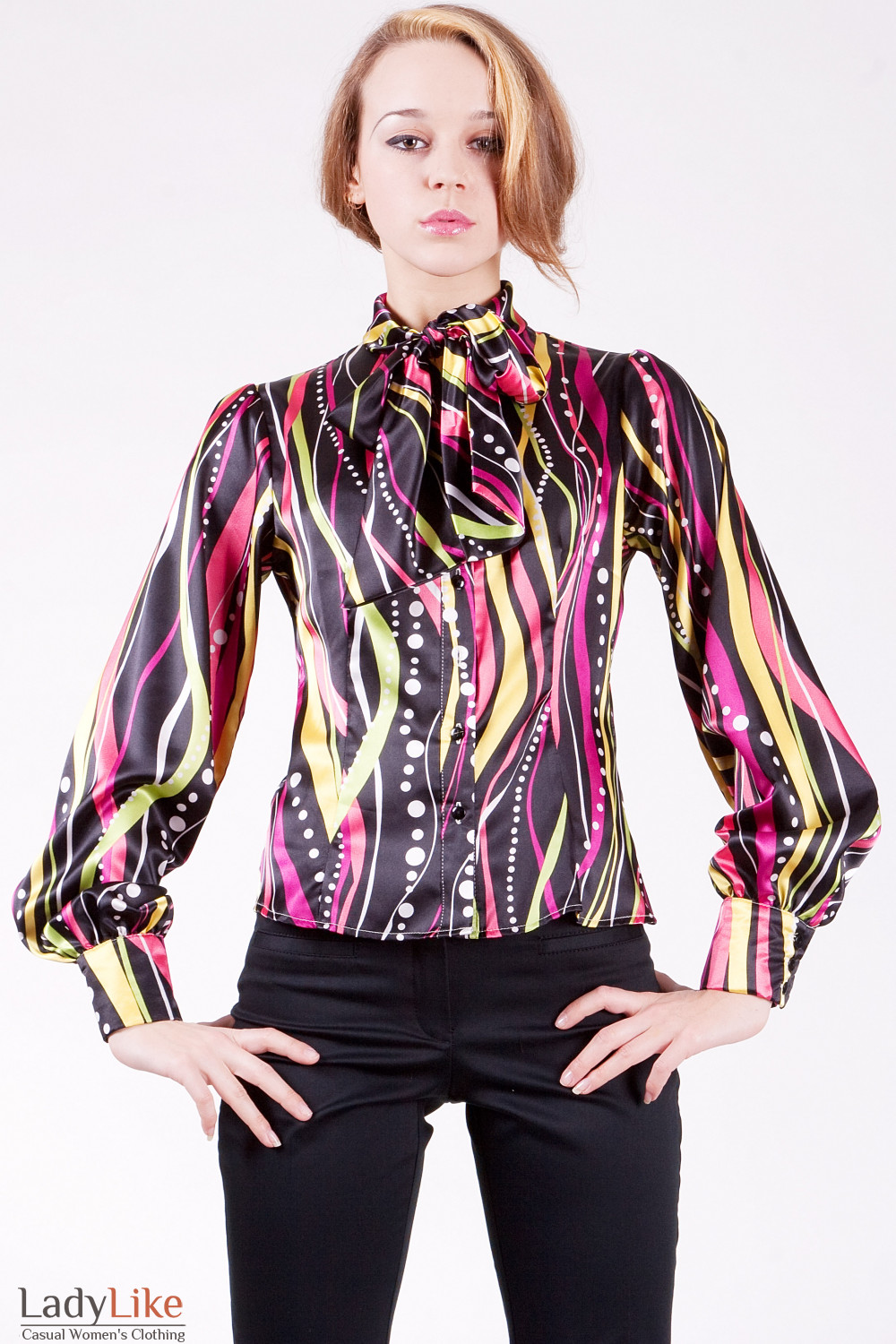 Эффектная атласная блузка облегающего покроя. Длинный рукав с широкой манжетой на трех пуговицах. Застегивается на пуговицы, воротник украшен бантом. Длина ок. 55 см. Состав: 60% вискоза, 40% полиэстер.