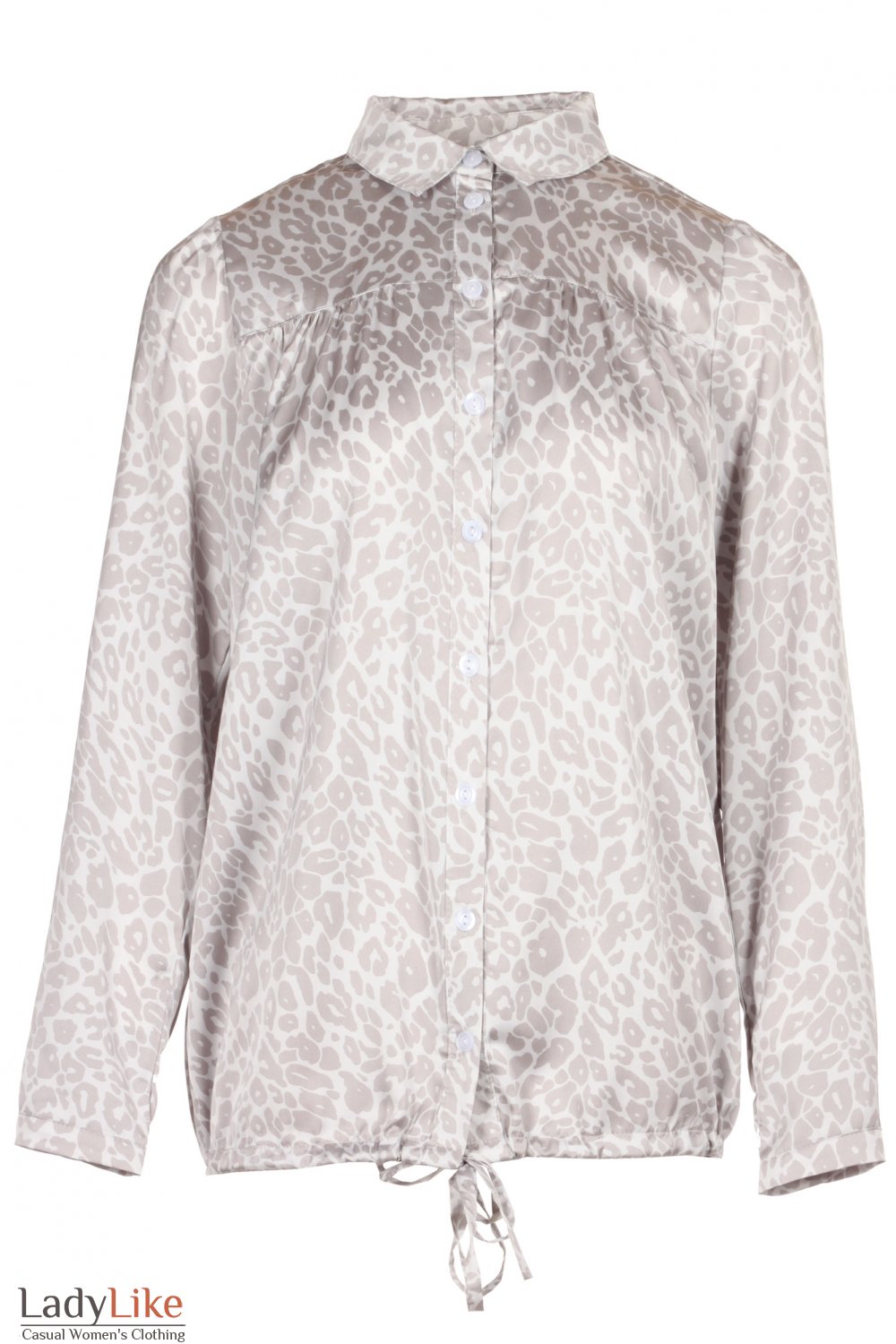 Блузка сірого кольору, Animal Print. Пряма, попереду кокетка з основної тканини з невеликими защипами, комір стояче відкладний, попереду застібається на гудзики. Рукави довгі з тонкими манжетами, застібаються на один гудзик, вниз блузки вставлена куліса. Довжина 65 см.