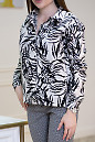 Блузка бежева, у велике чорне листя папороті. Комір стояче-відкладний, застібається попереду на гудзики. Довгий рукав з манжетою на один гудзик. Ззаду блузка подовжена. З боків невеликі розрізи, що застібаються на гудзики.