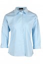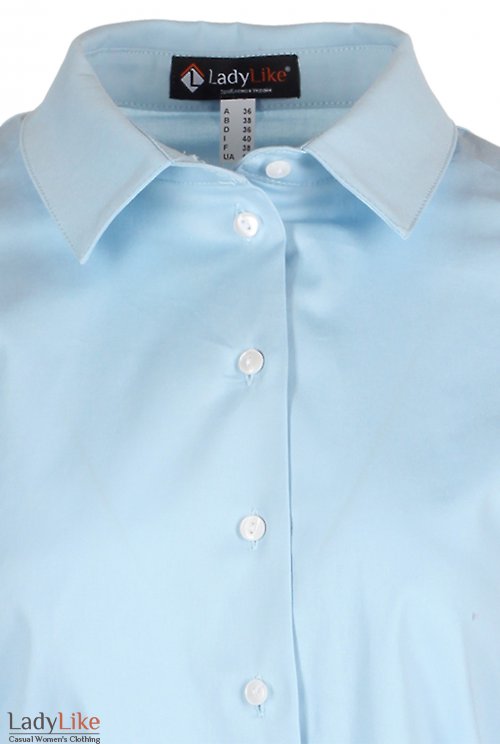 Блузка блакитна з натуральної бавовни. Рукав цільнокроєний (летюча миша) з відворотною манжетою. Комір стояче-відкладний. Застібка на гудзики. Довжина блузка 64 см.