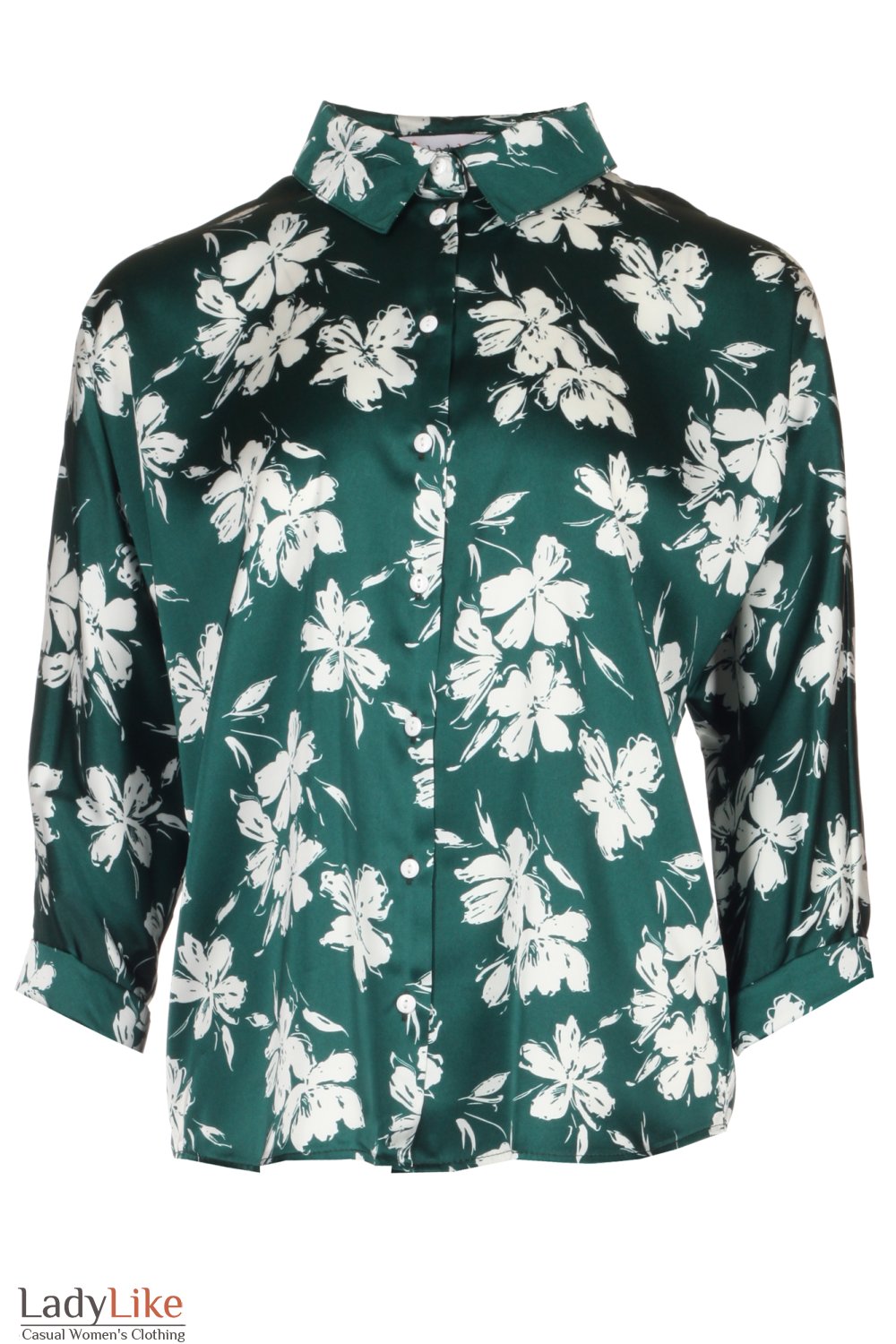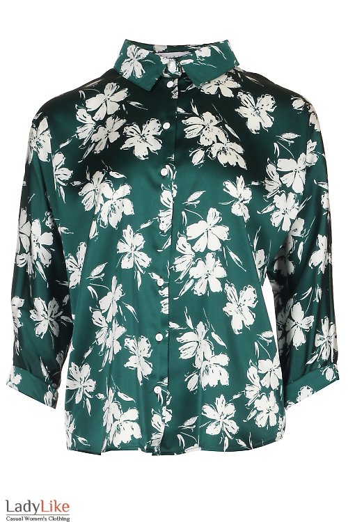 Жіноча блузка зеленого кольору у великі білі квіти. Пряма, цілісно викроєні рукави в японському стилі (кажан) з відворотною манжетою. Комір стояче-відкладний. Попереду застібається на гудзики, низ закруглений. Довжина блузки 65 см.