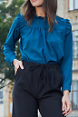 Блузка вільного крою у кольорі мурена. Попереду та ззаду кокетка з невеликими складочками. Рукав довгий з манжетою, застібається на один гудзик. Горловина та плечі прикрашені невеликими рюшами.