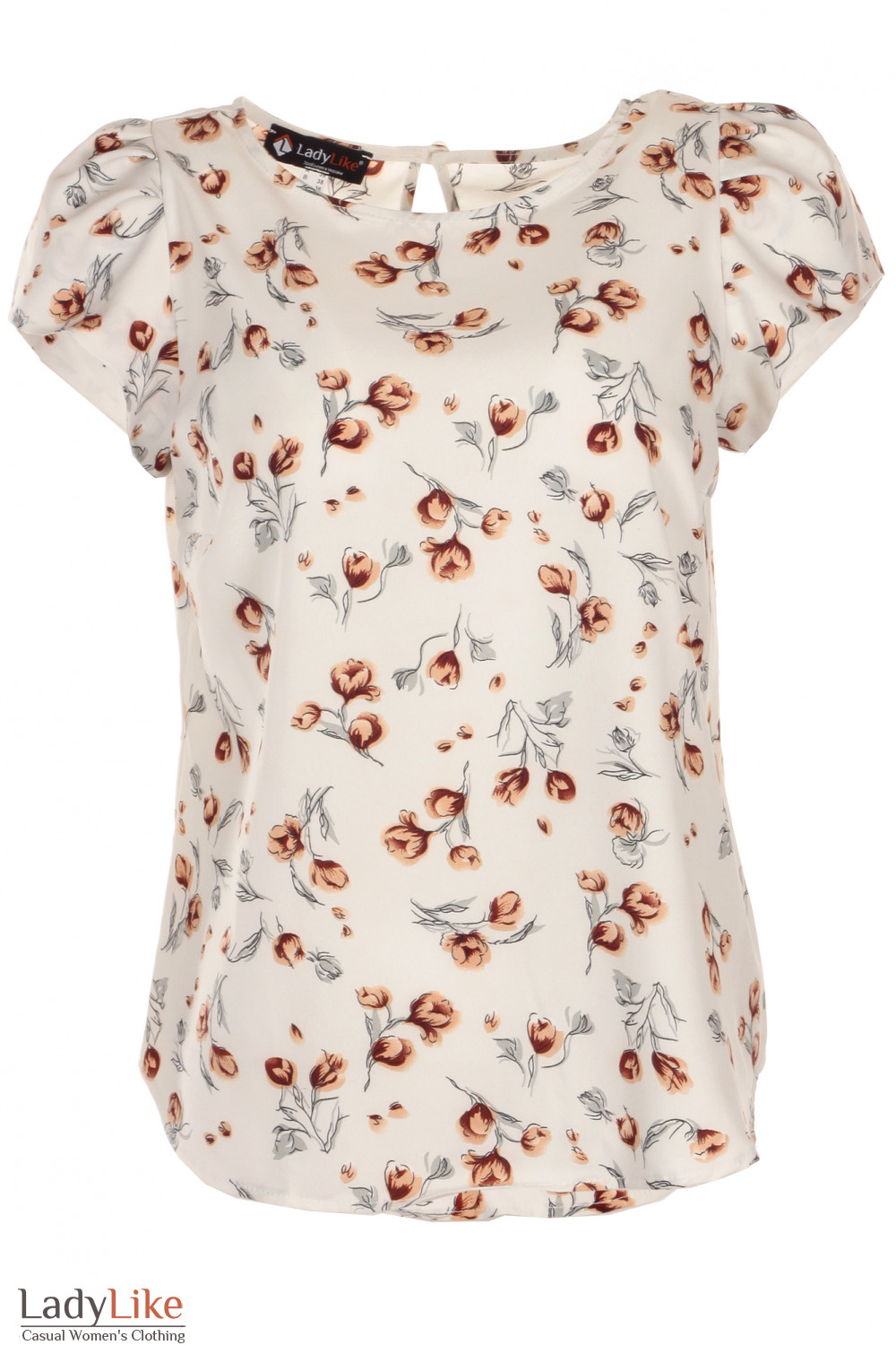 Літня блузка з білого софту в коричневу квіточку. Напівприталений силует. Короткий рукав-ліхтарик. Круглий виріз горловини з гудзиком по спинці.