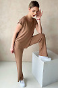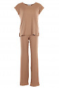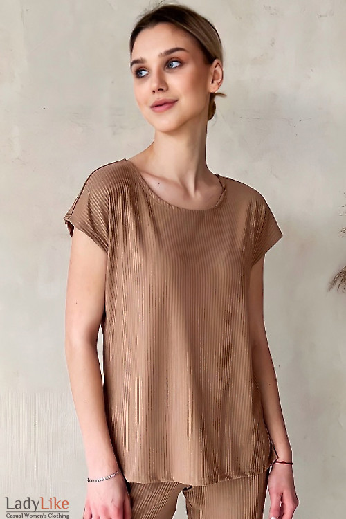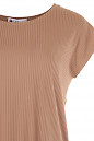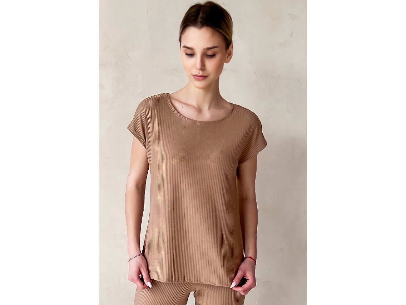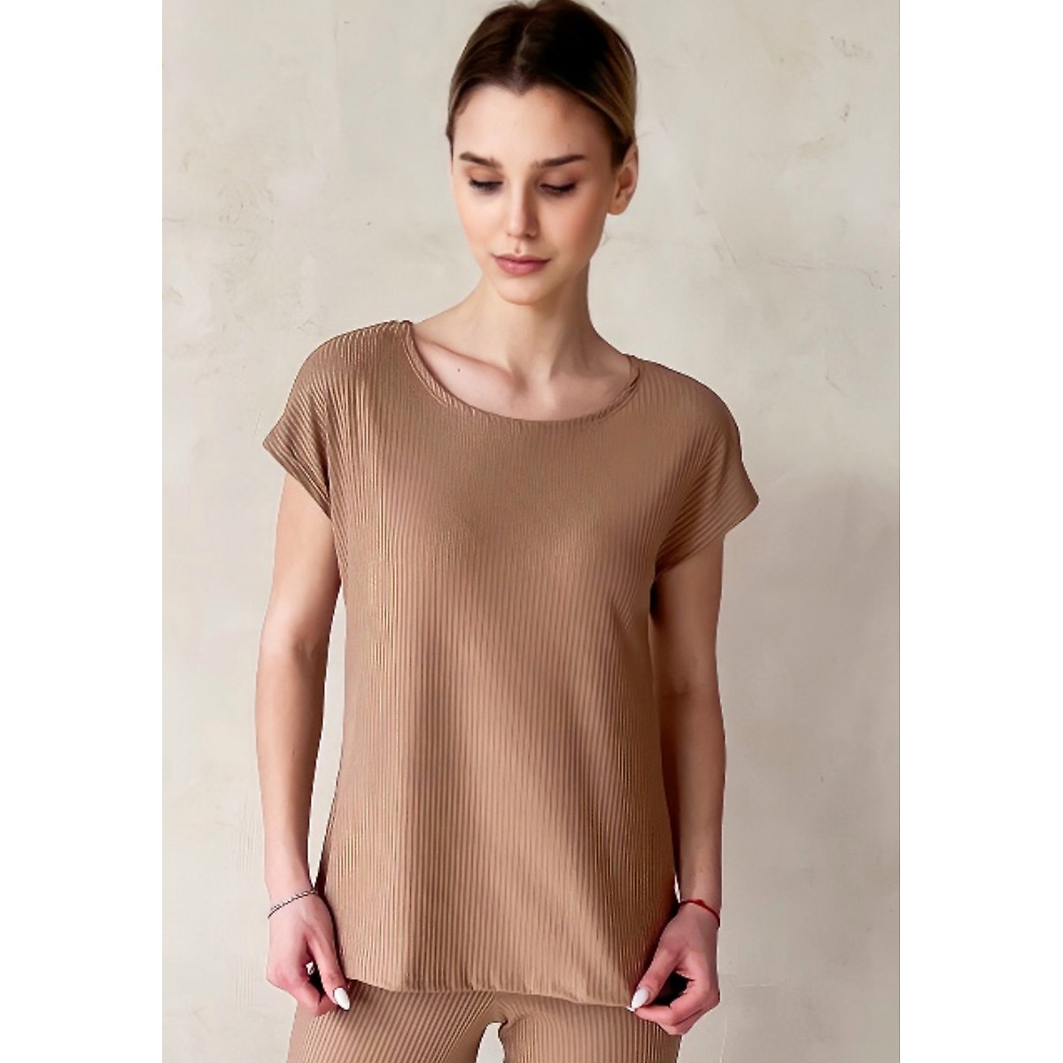 Легка трикотажна футболка бежевого кольору. Пряма, короткий спущений рукав, виріз горловини круглий. З боків невеликі розрізи.