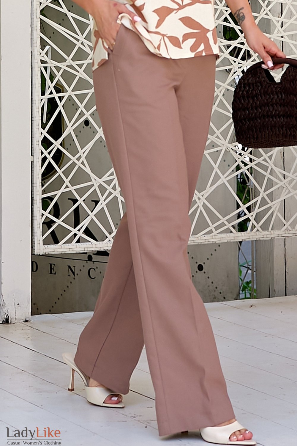 Штани прямі від стегна джинсові бежевого кольору. Висока посадка, на поясі шльовки для ременя. З обох боків прорізні кишені, ззаду кишені обманки. Попереду застібаються на блискавку та гудзик. Довжина 102 см.