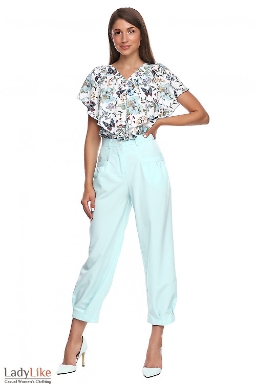 Літні бірюзові вкорочені брюки. Висока посадка в талії. Спереду прорізні кишені. Низ штанин призібраний защипами. На поясі передбачені петлі для ременя. Довжина по внутрішньому шву 65 см.
