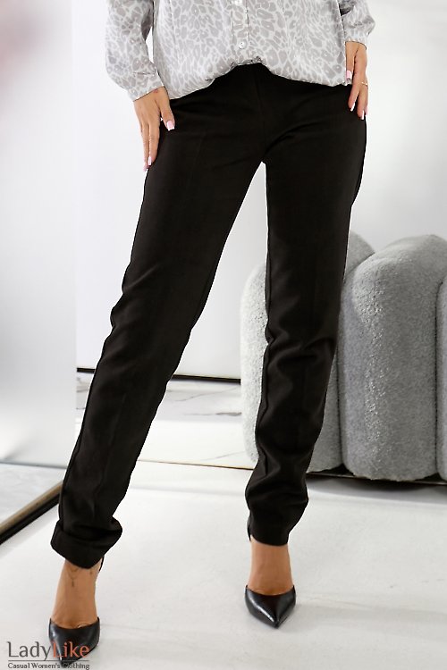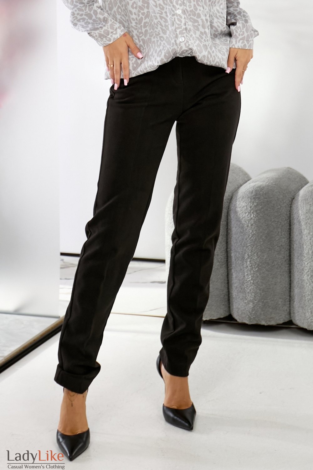 Теплі прямі жіночі штани чорного кольору із завищеною талією. Втачний пояс із шльовками для ременя. Застібаються попереду на спіральну блискавку та гудзик. Позаду кишені обманки з листочком.