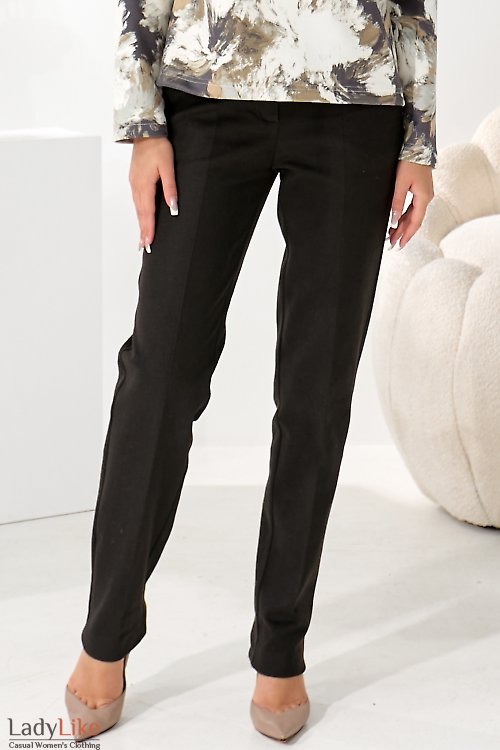 Жіночі теплі штани з високою посадкою, чорного кольору. Прямі з обох боків прорізні кишені, ззаду кишені-обманки. На поясі шльовки для ременя. Застібаються на блискавку та гудзик. Довжина 100 см.