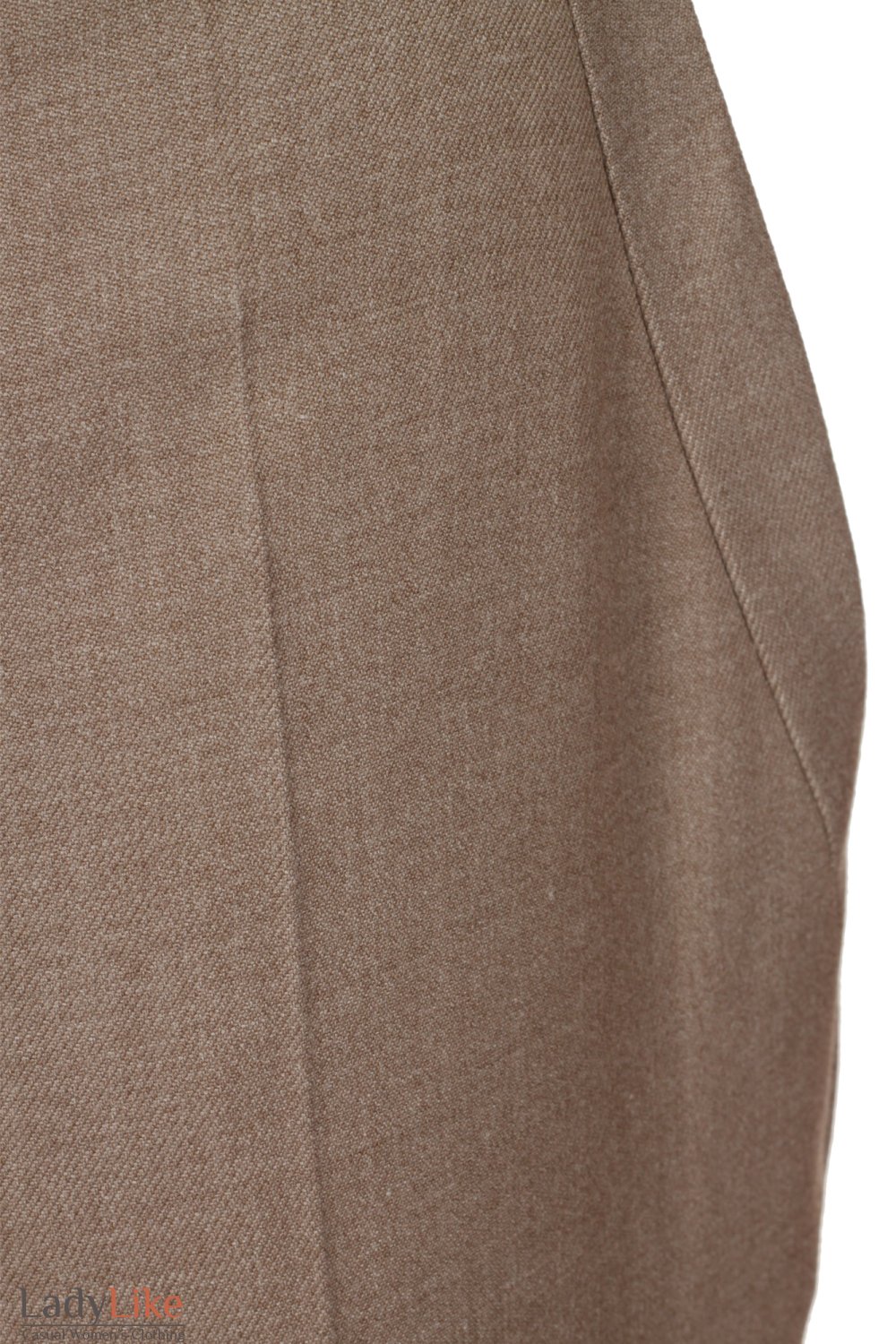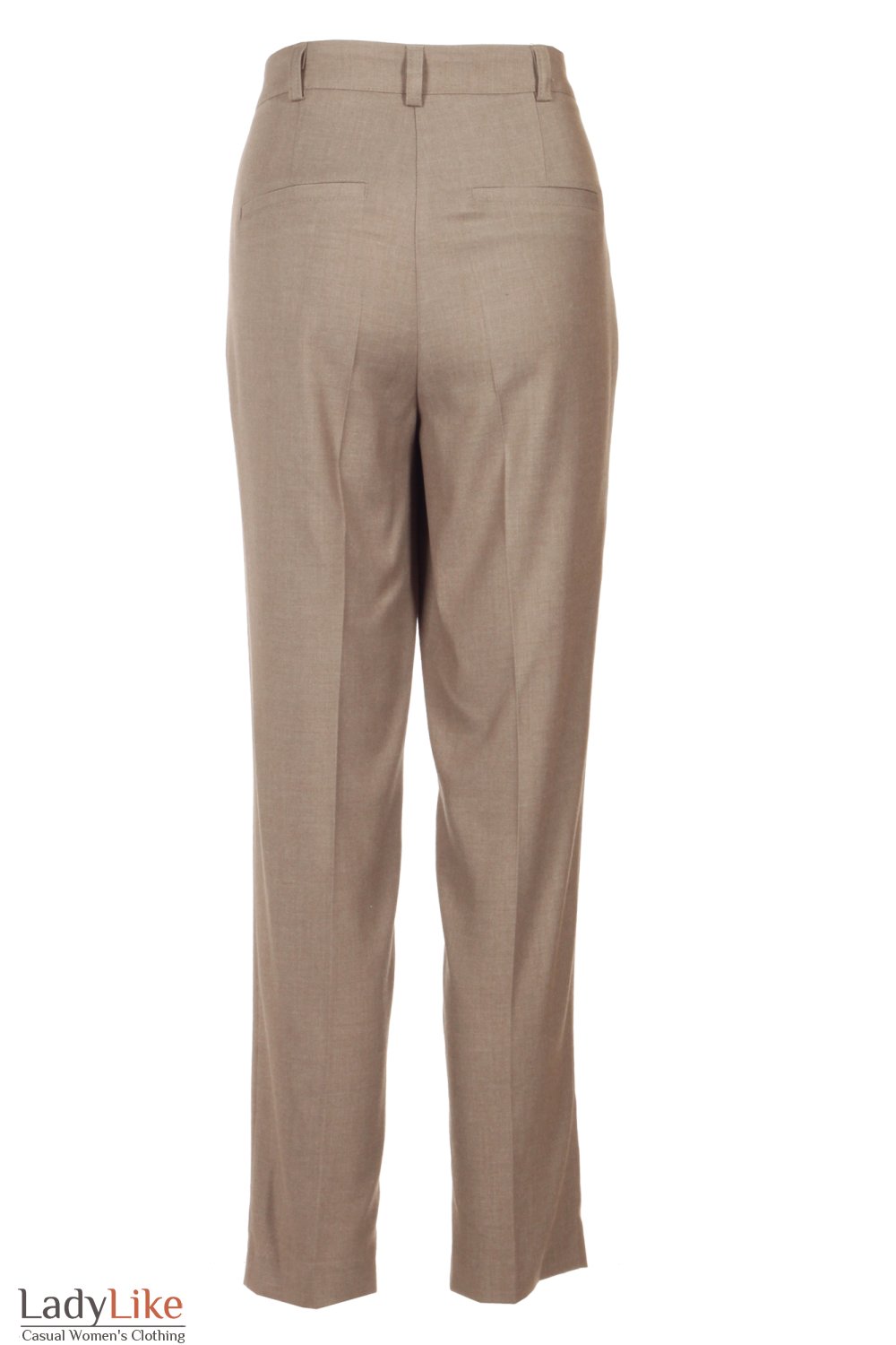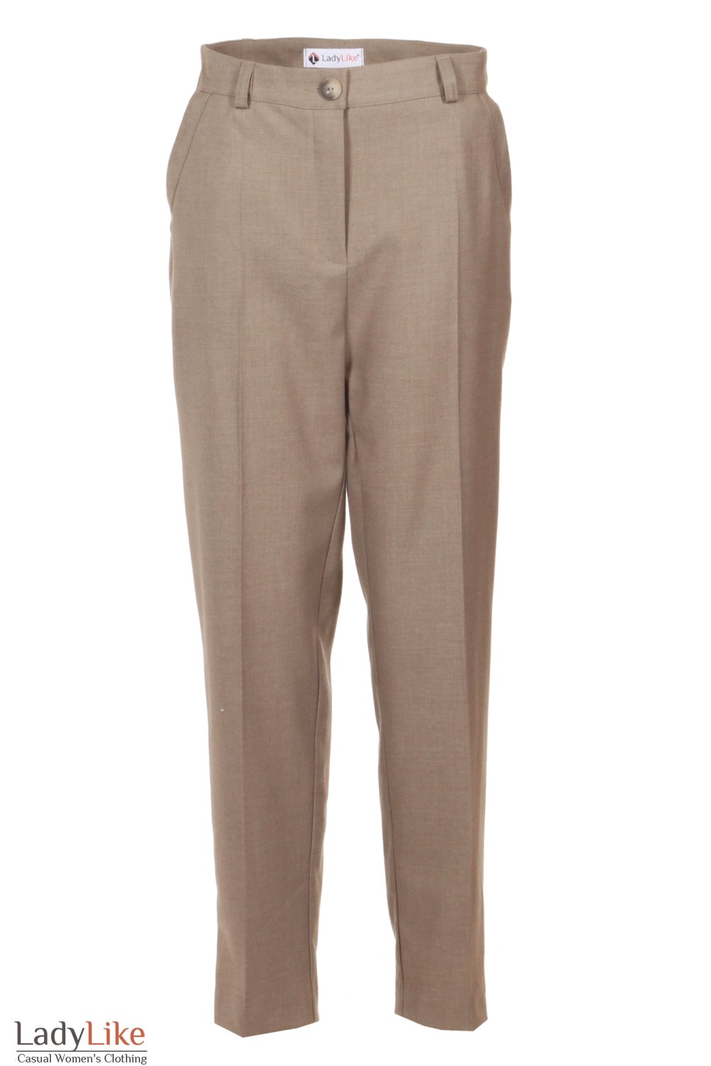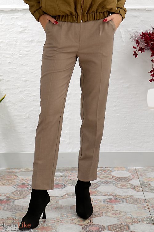 Жіночі брюки бежевого кольору. Висока посадка, застібаються на блискавку та гудзик. З обох боків прорізні кишені, ззаду кишені-обманки. На поясі шльовки для ременя. Довжина 100 см.