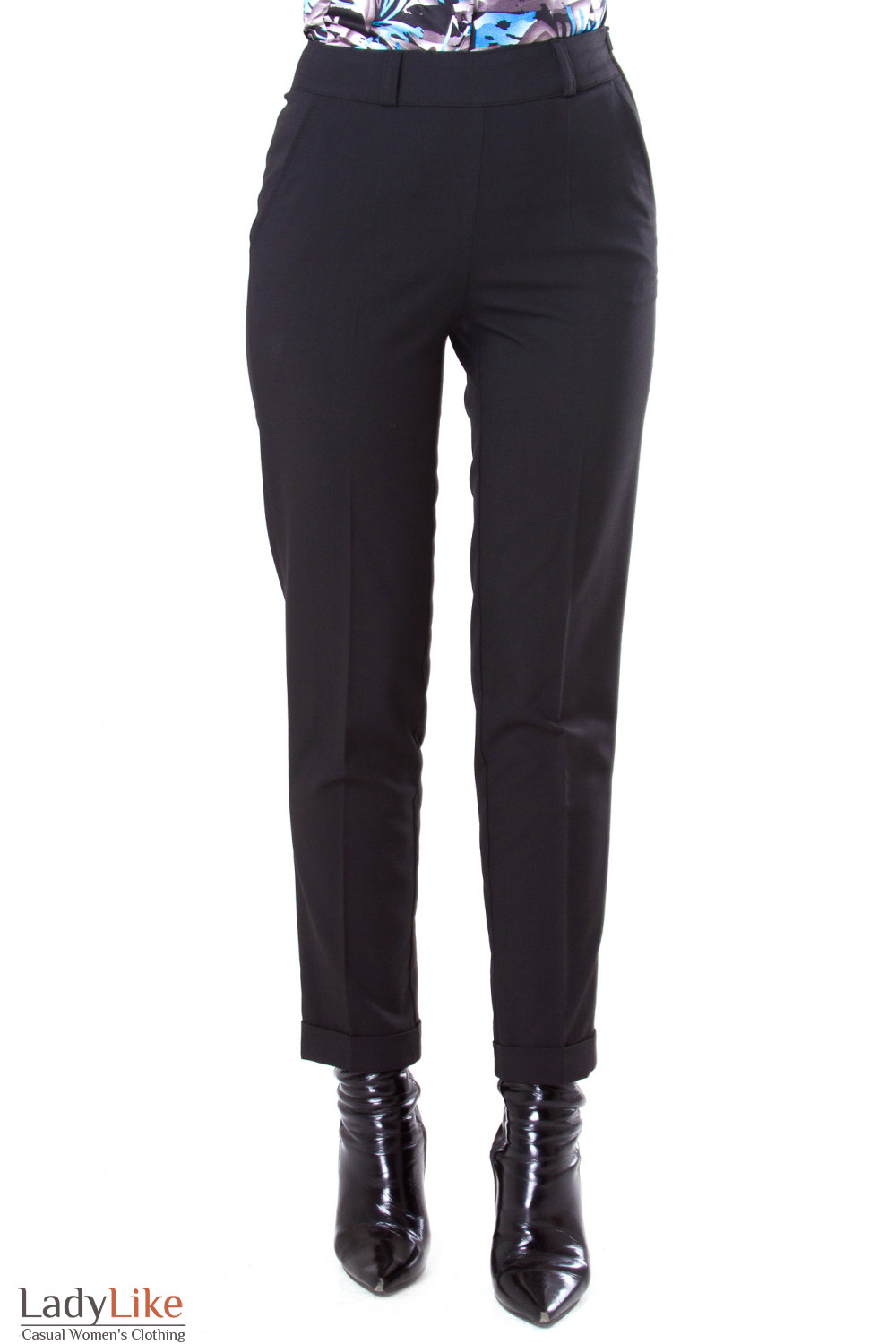 Завужені вкорочені чорні брюки. Бокові прорізні кишені. Застібка на блискавку збоку. Ззаду кишені-обманки. По низу брюк - манжети. Довжина близько 65 см. Склад: 53% віскоза, 35% поліестер, 10% бавовна, 2% еластан.