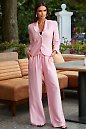 Короткий льняний жакет, рожевого кольору з підкладкою. Приталений силует, застібається на два гудзики. Англійський відкладний комір з лацканами. Рукави три чверті. Довжина 53 см. Літні штани із льону рожевого кольору. Прямий широкий крій, попереду гульфік обманка, з обох боків прорізні кишені, пояс втачний на резинці з куліскою. Довжина штанів 109 см