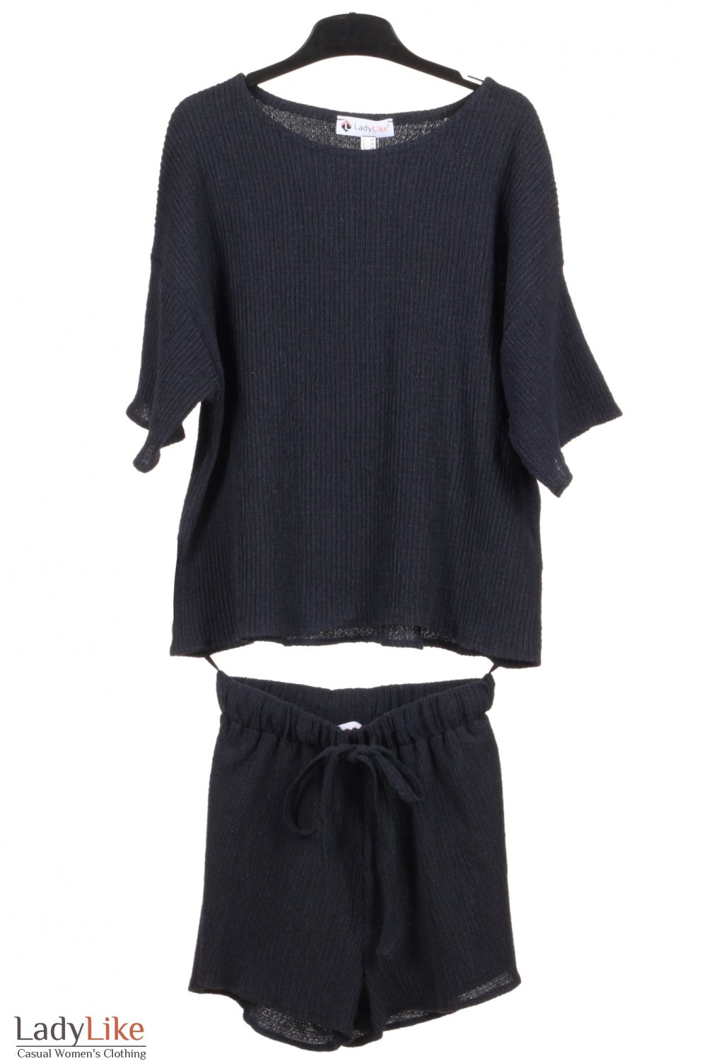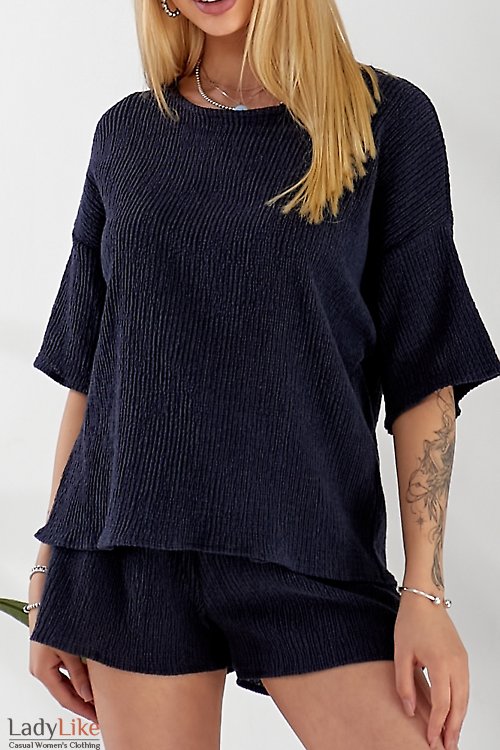Домашній синій костюм з жатки. Складається з вільного топа з коротким рукавом та комфортних шортів на резинці з поясом. Ідеальний для затишного відпочинку вдома.