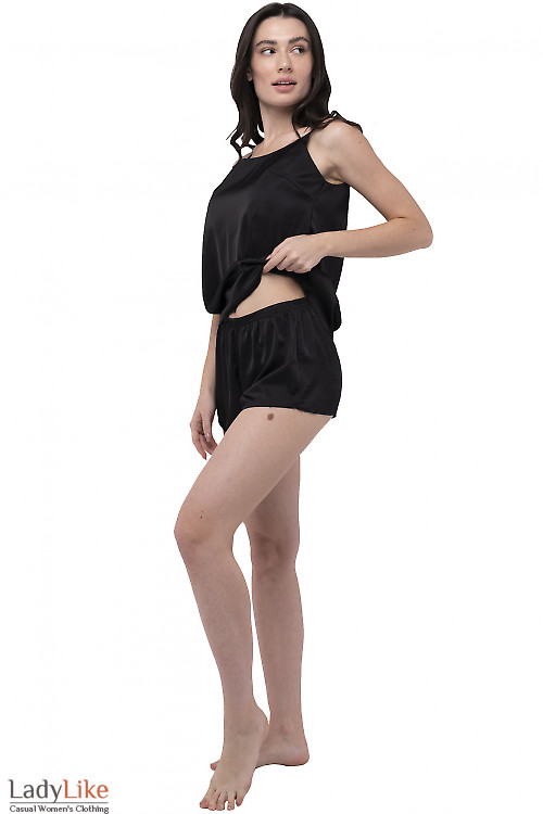 Жіноча чорна шовкова піжама складається із майки та шортиків. Майка на тонких регульованих бретелях. Шорти короткі, з м'якою гумкою в поясі.