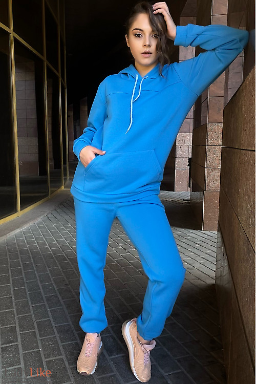 Тепла худі з капюшоном блакитного кольору. Попереду кокетка з основної тканини та накладна кишеня kangaroo. Рукава довгі з манжетою. Теплі спортивні штани блакитного кольору, прямі, манжет на гумці, з боків прорізні кишені.