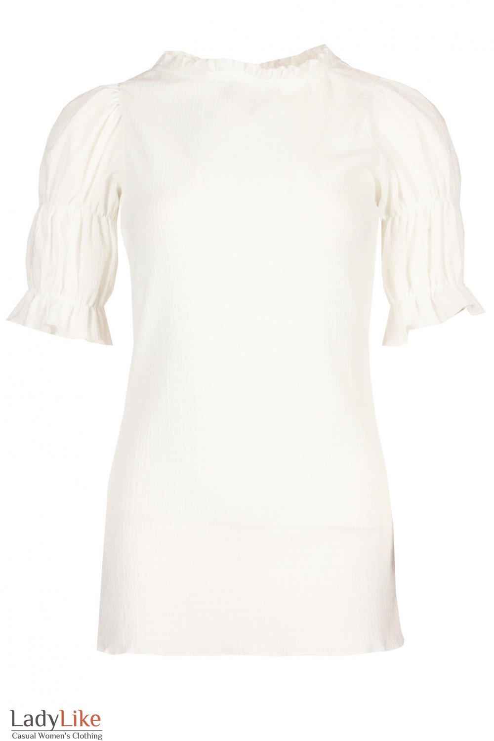Кофта із білого трикотажу жатка. Пряма, подовжена, круглий виріз горловини з тонкими рюшами. Рукави короткі на резинці у вигляді ліхтарика з рюшами. Довжина 70 см.