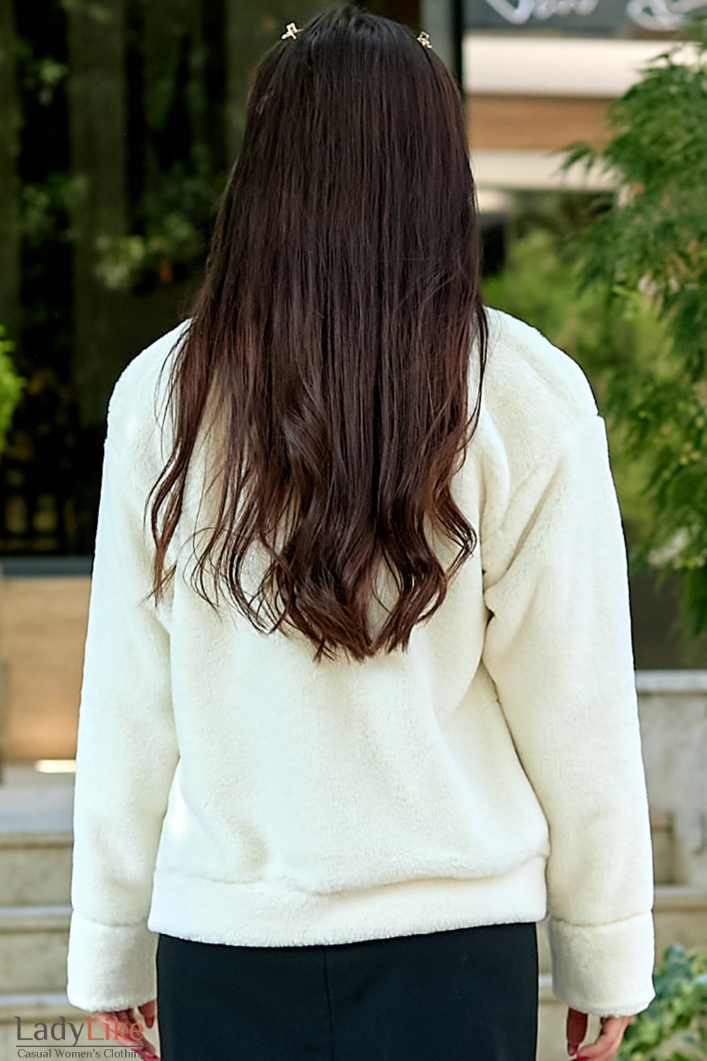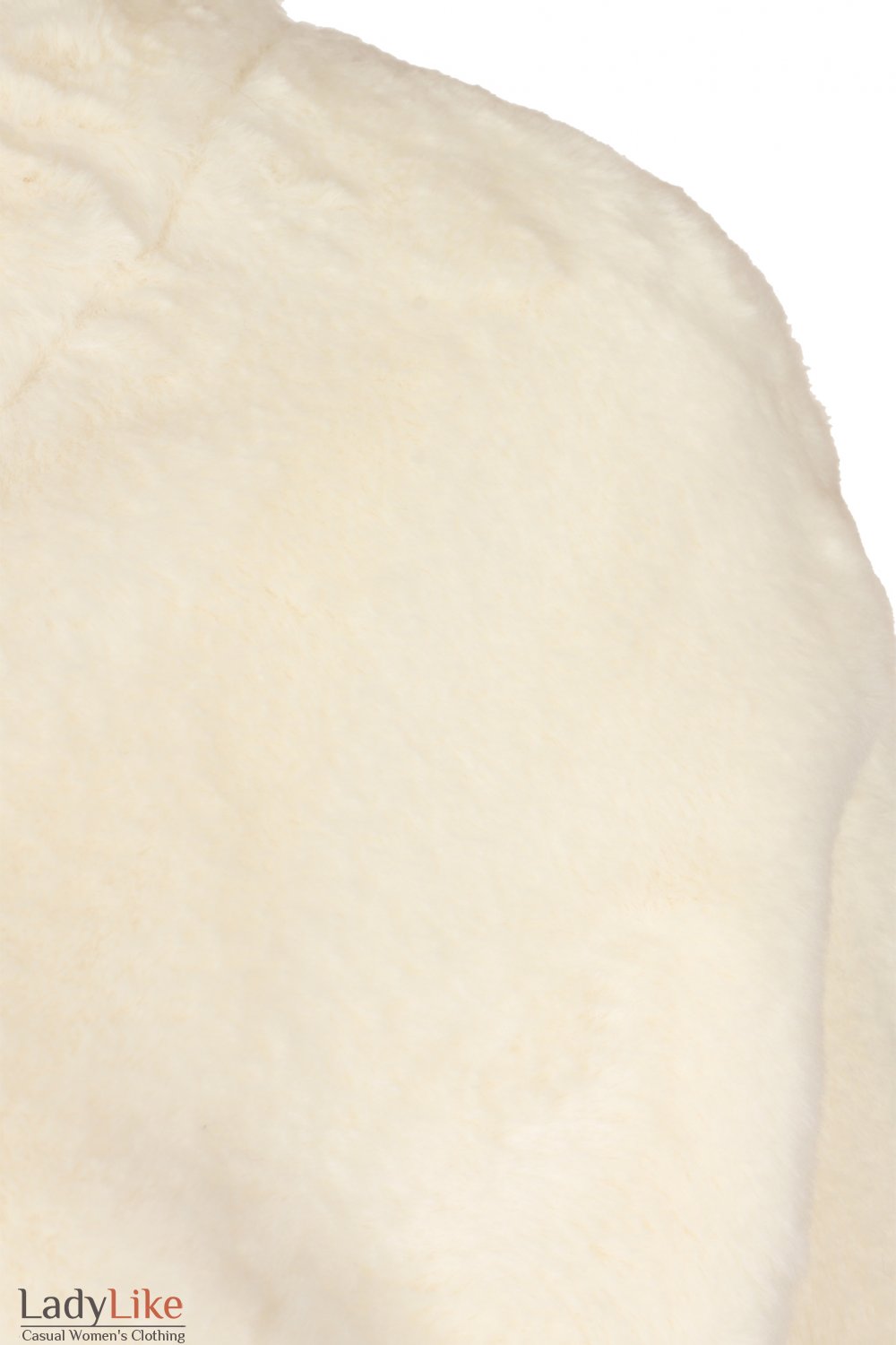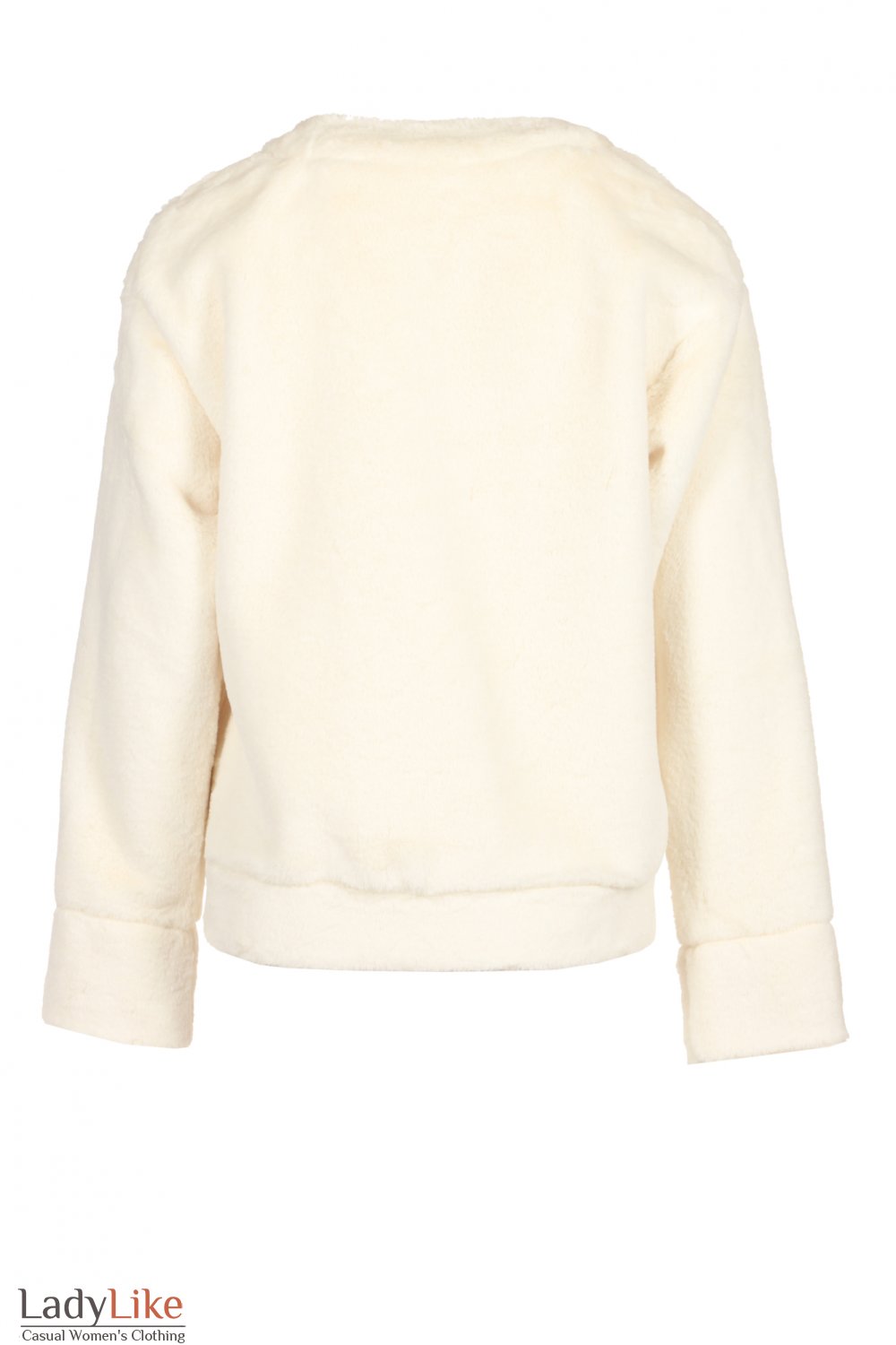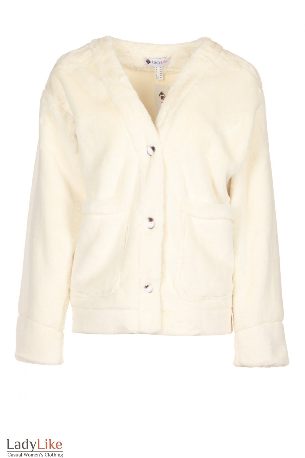 Кофта зі штучного хутра тепла, білого кольору. Прямого крою, V-виріз горловини, застібається на три гудзики. Рукави довгі. Попереду накладні кишені. Довжина 68 см.