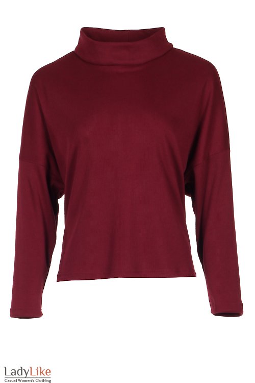 Широка кофта трикотаж бордового кольору. Пряма, кругла виріз горловини з невисокою стійкою. Рукави спущені довгі. Довжина 57 см.