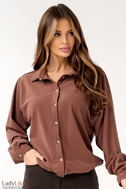 Блузка трикотаж фліс бежевого кольору. Пряма, комір стояче відкладний, попереду застібається на гудзики. Рукава довгі з тонкими манжетами на один гудзик. Вниз блузки вставлено кулісу. Довжина 60 см.
