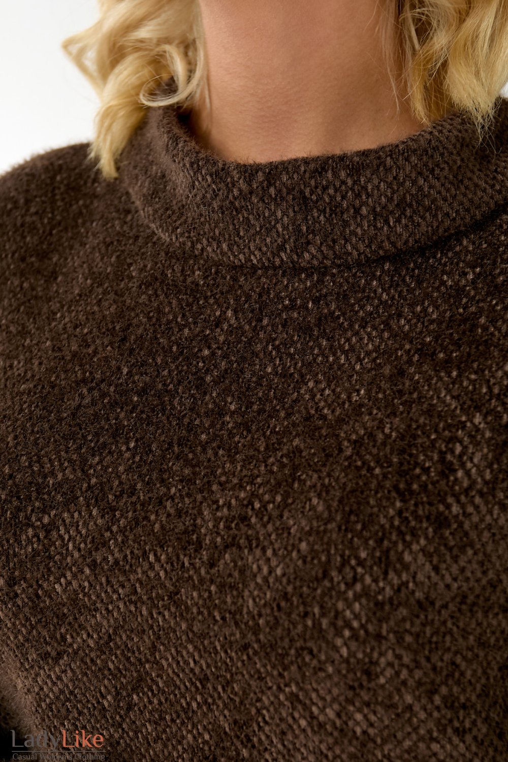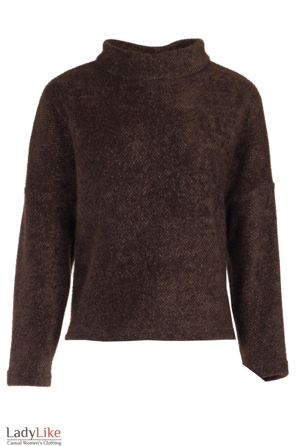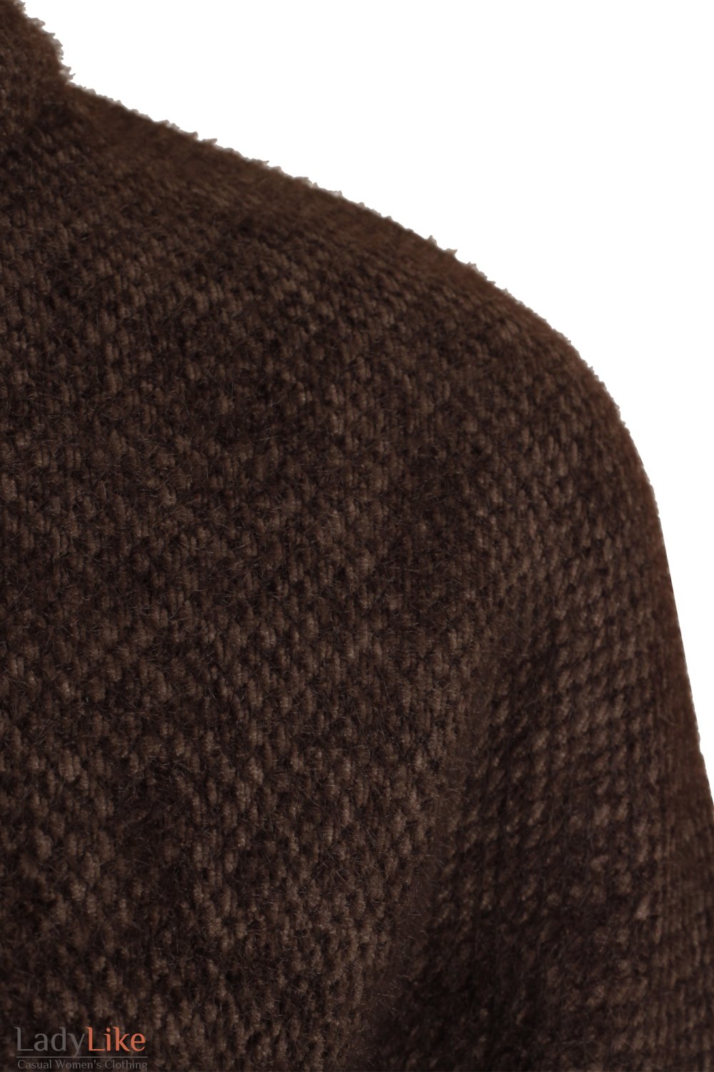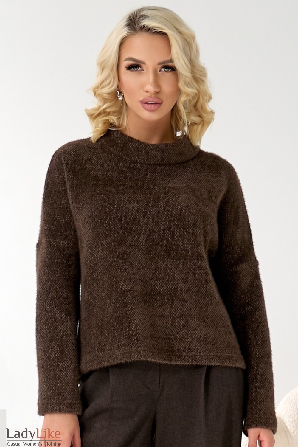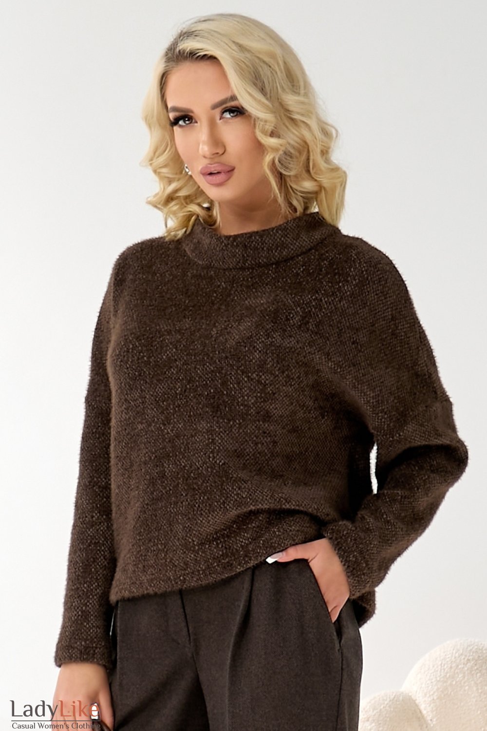 Кофта тепла, трикотаж пухнастий ангора коричневого кольору. Пряма широка круглий виріз горловини з невисокою стійкою. Рукави спущені довгі. Довжина 57 см.