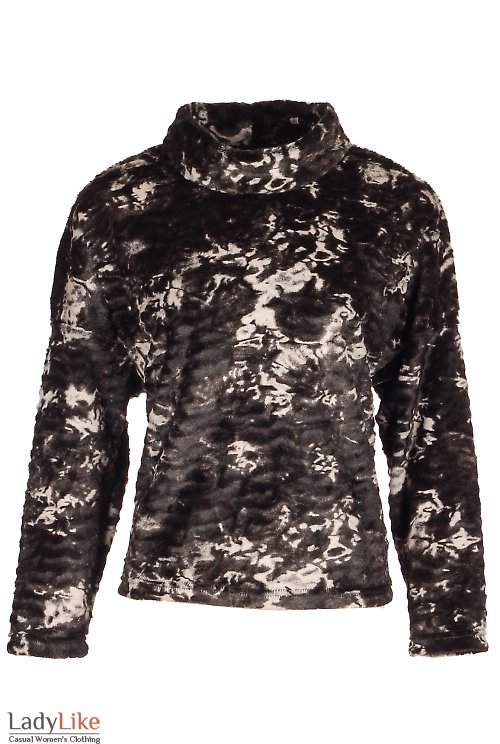 Тепла кофта з м'якої тканини. Вільний силует. Рукав - летюча миша. Широкий круглий виріз горловини з коміром-стійкою.