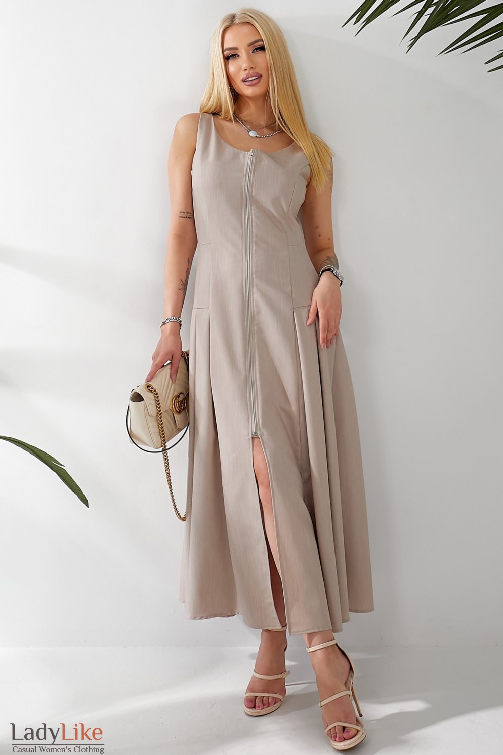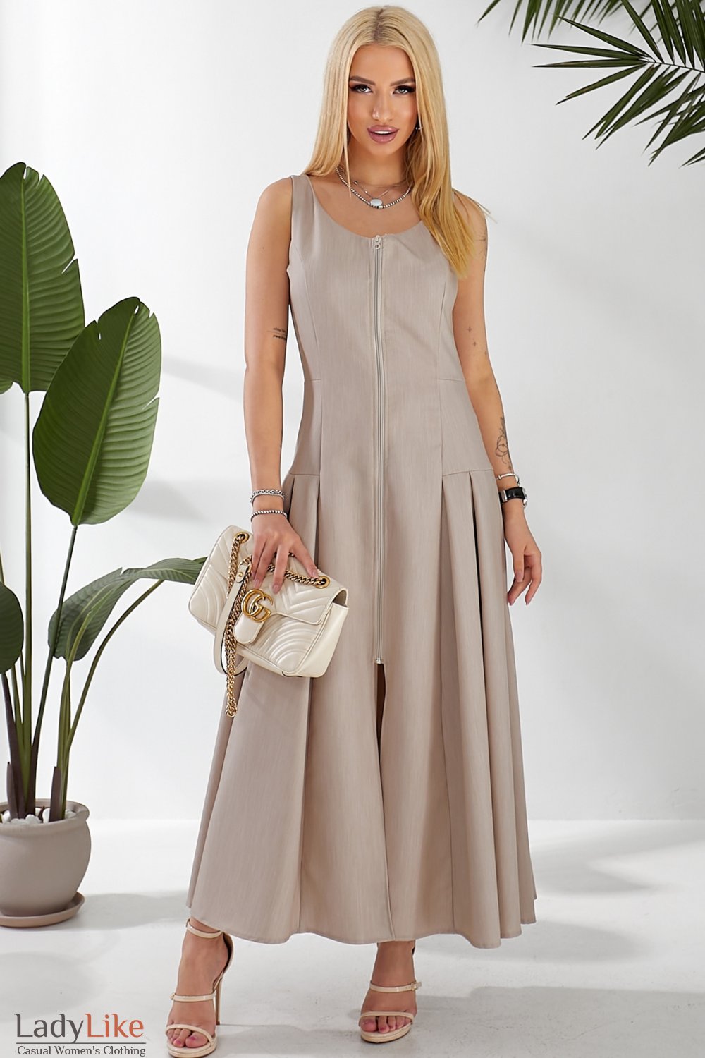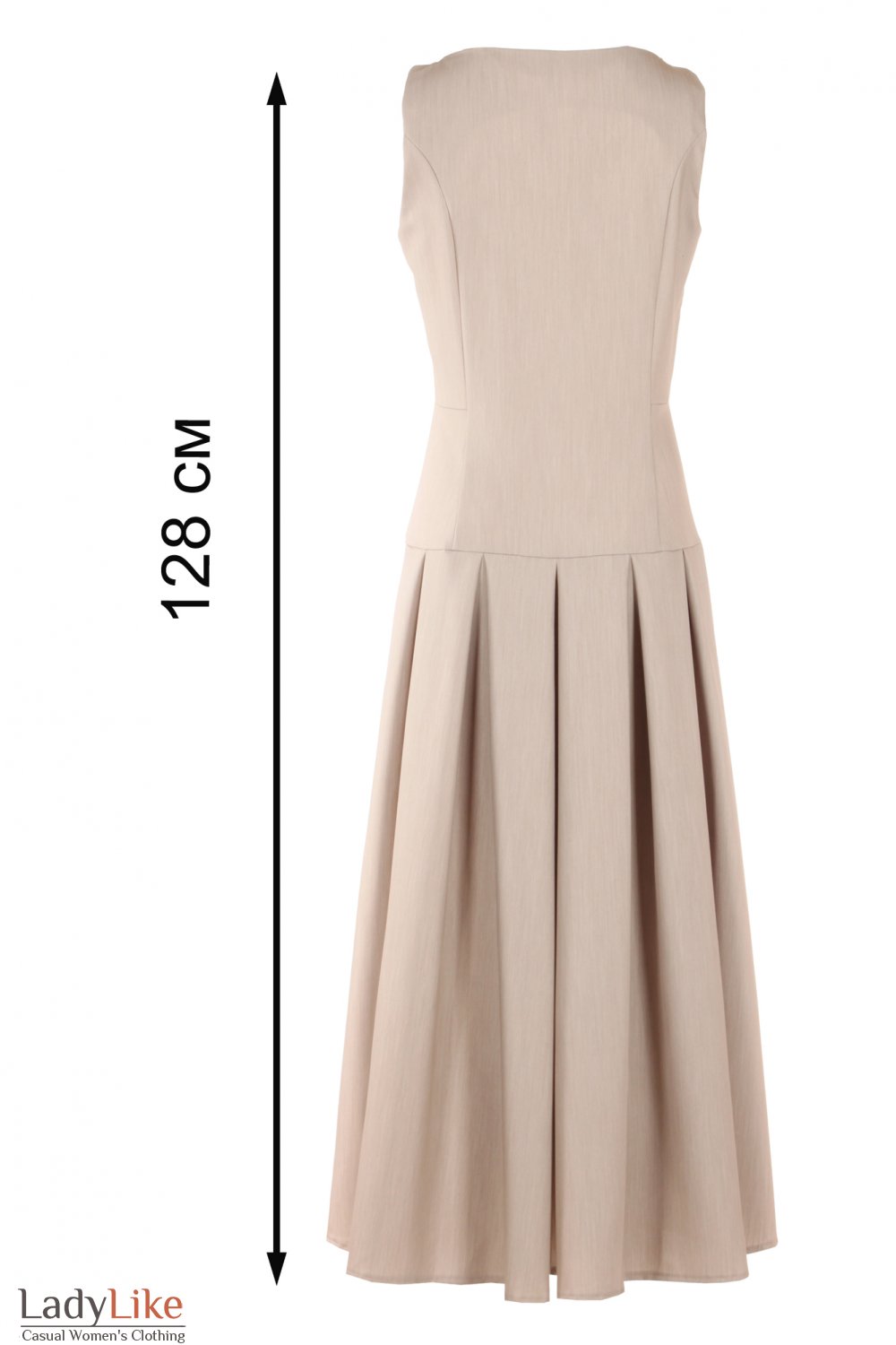 Сарафан максі бежевого кольору. Приталений на талії, з боків вставки з основної тканини, спідниця із защипами у вигляді зустрічної складки. Попереду застібається на блискавку. Довжина 128 см.