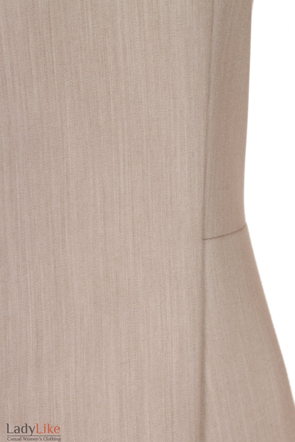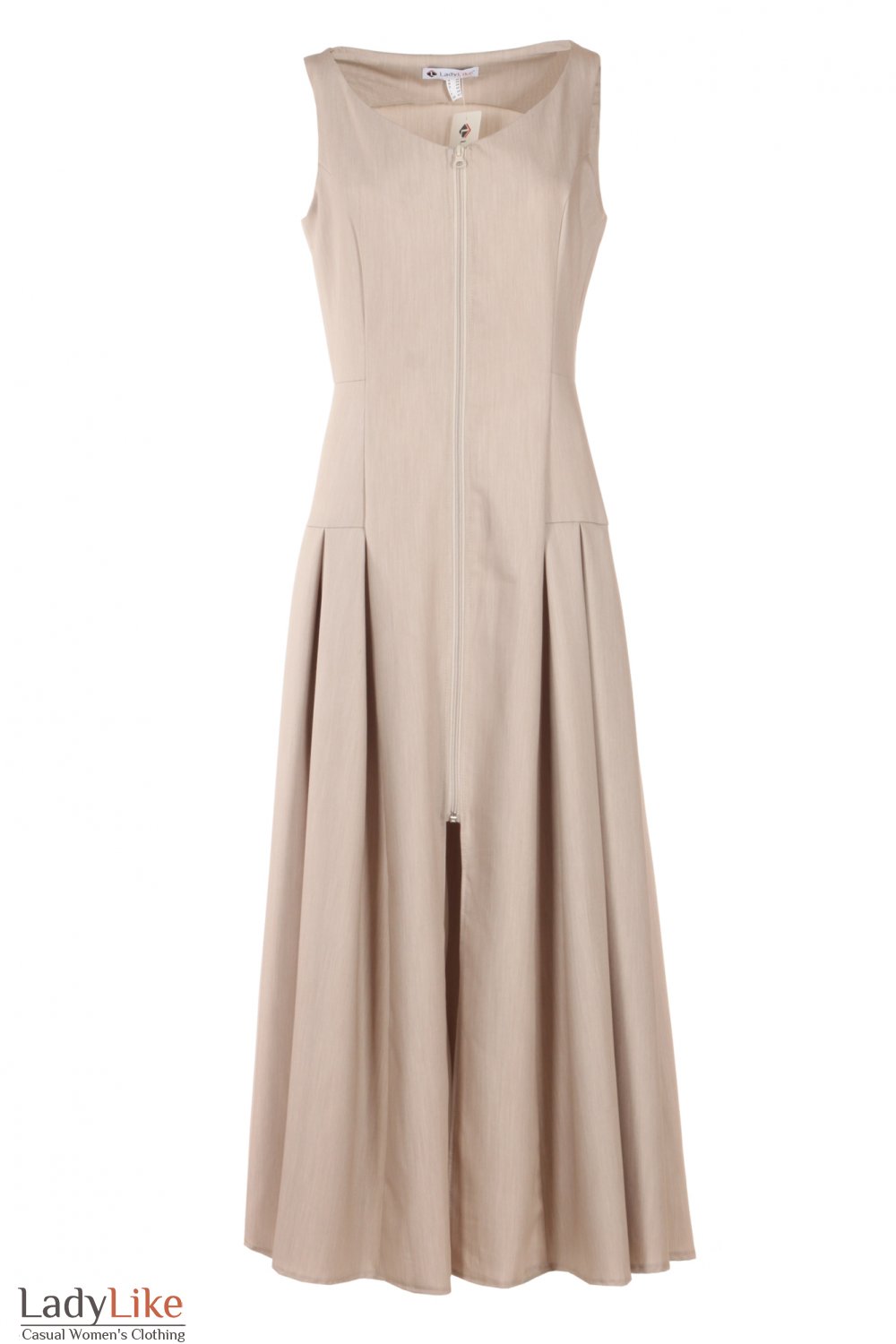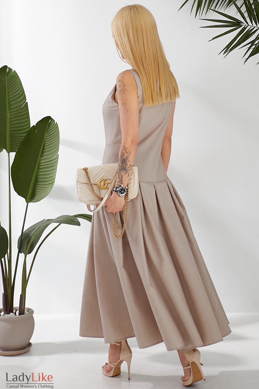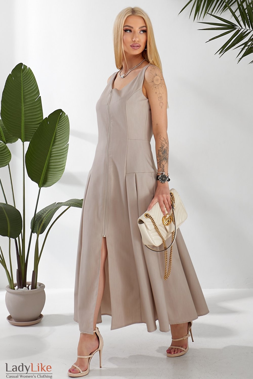 Сарафан максі бежевого кольору. Приталений на талії, з боків вставки з основної тканини, спідниця із защипами у вигляді зустрічної складки. Попереду застібається на блискавку. Довжина 128 см.