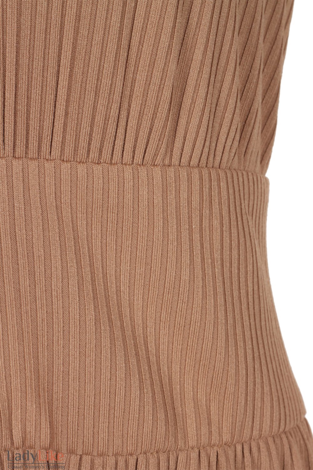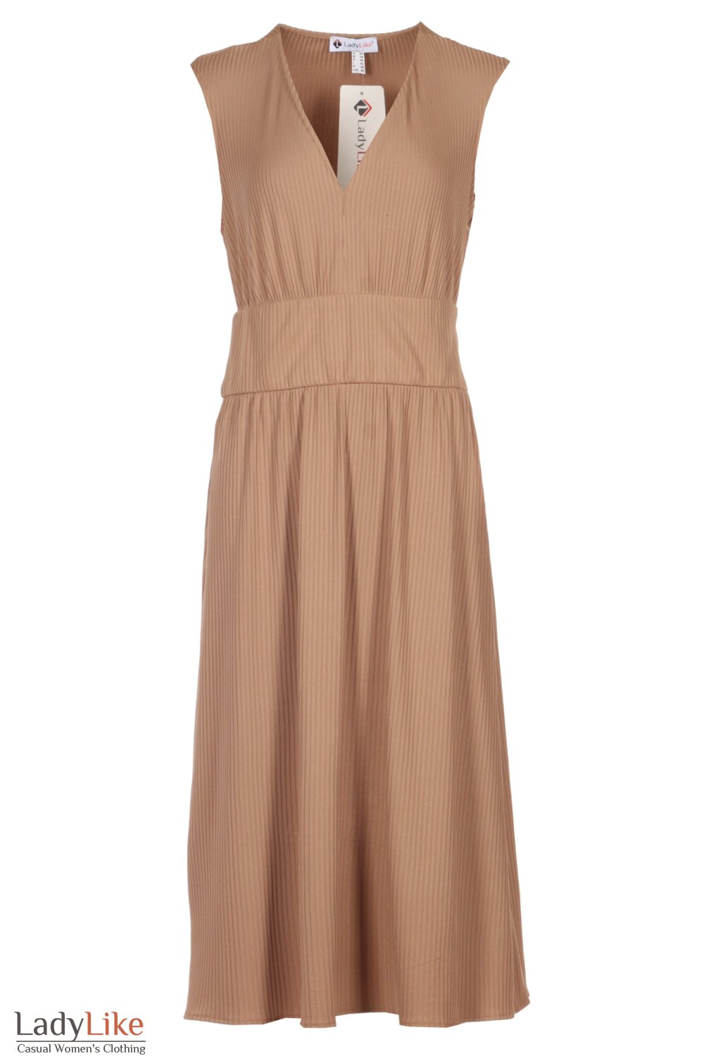 Сукня з легкого трикотажу у рубчик бежевого кольору. Пряме на талії кокетка з основної тканини шириною 13 см. V-виріз горловини. Без рукавів. Довжина близько 115 см.