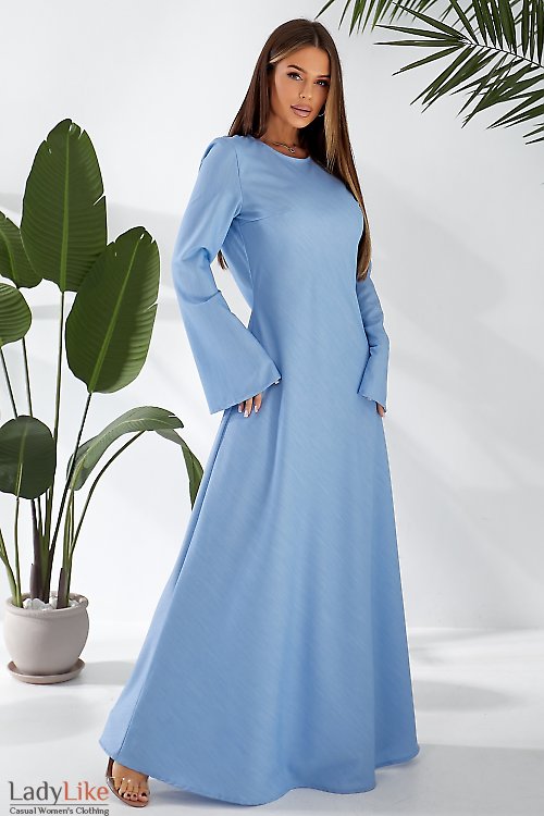Сукня максі із костюмної тканини, блакитного кольору. Приталене, донизу в стилі А-силует. Круглий виріз горловини, ззаду розріз у вигляді великої крапельки, застібається на один гудзик. Рукави довгі розкльошені. Довжина 145 см.