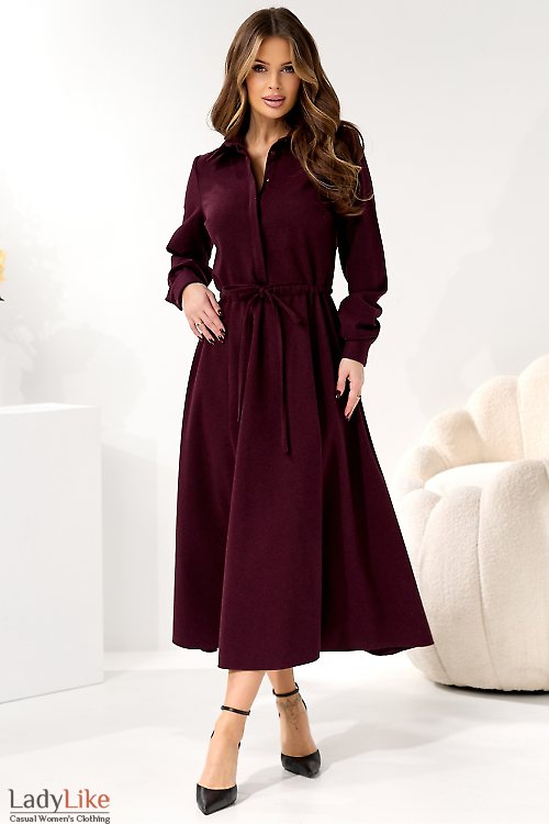 Сукня тепла, бордового кольору. Верх приталений, відрізна талія, спідниця пишна, на поясі вставлена куліса. Комір стояче відкладний, спереду до пояса супатна застібка на ґудзиках. Рукави довгі з манжетами на два гудзики. Довжина 120 см.