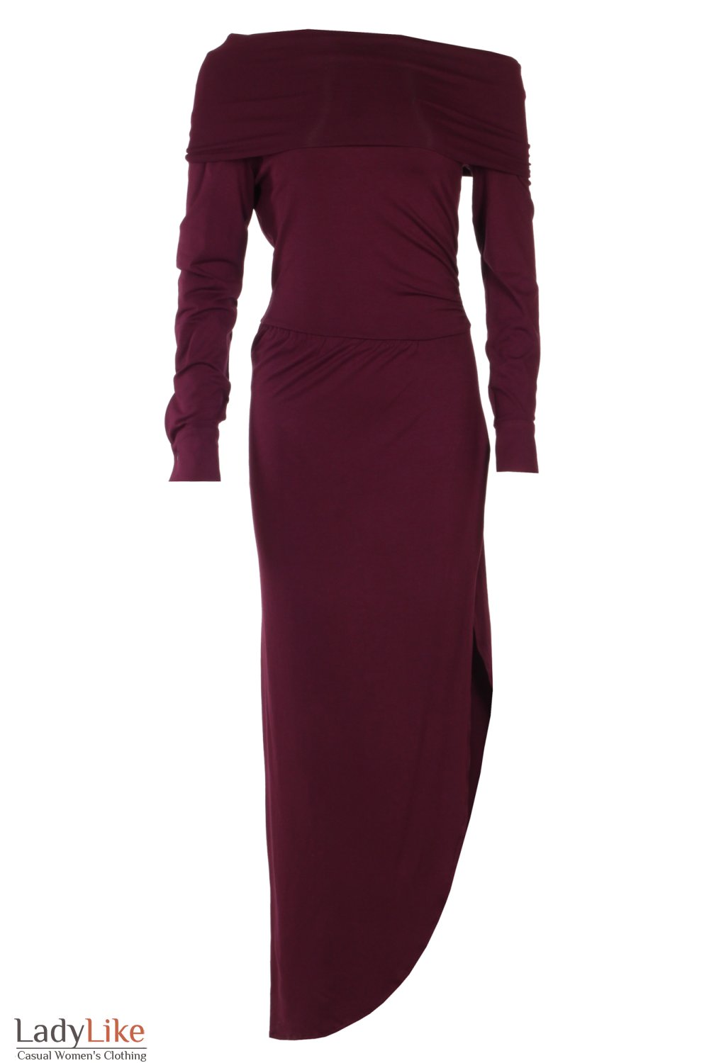 Сукня максі, тонкий трикотаж колір burgundy. Пряма, з драпіруванням на талії. Горловина шалева комір, з відкритим плечем. Рукави довгі з манжетами застібаються на один гудзик. Збоку глибокий розріз який надає розкоші та ефектності кожному кроці. Довжина 135 см