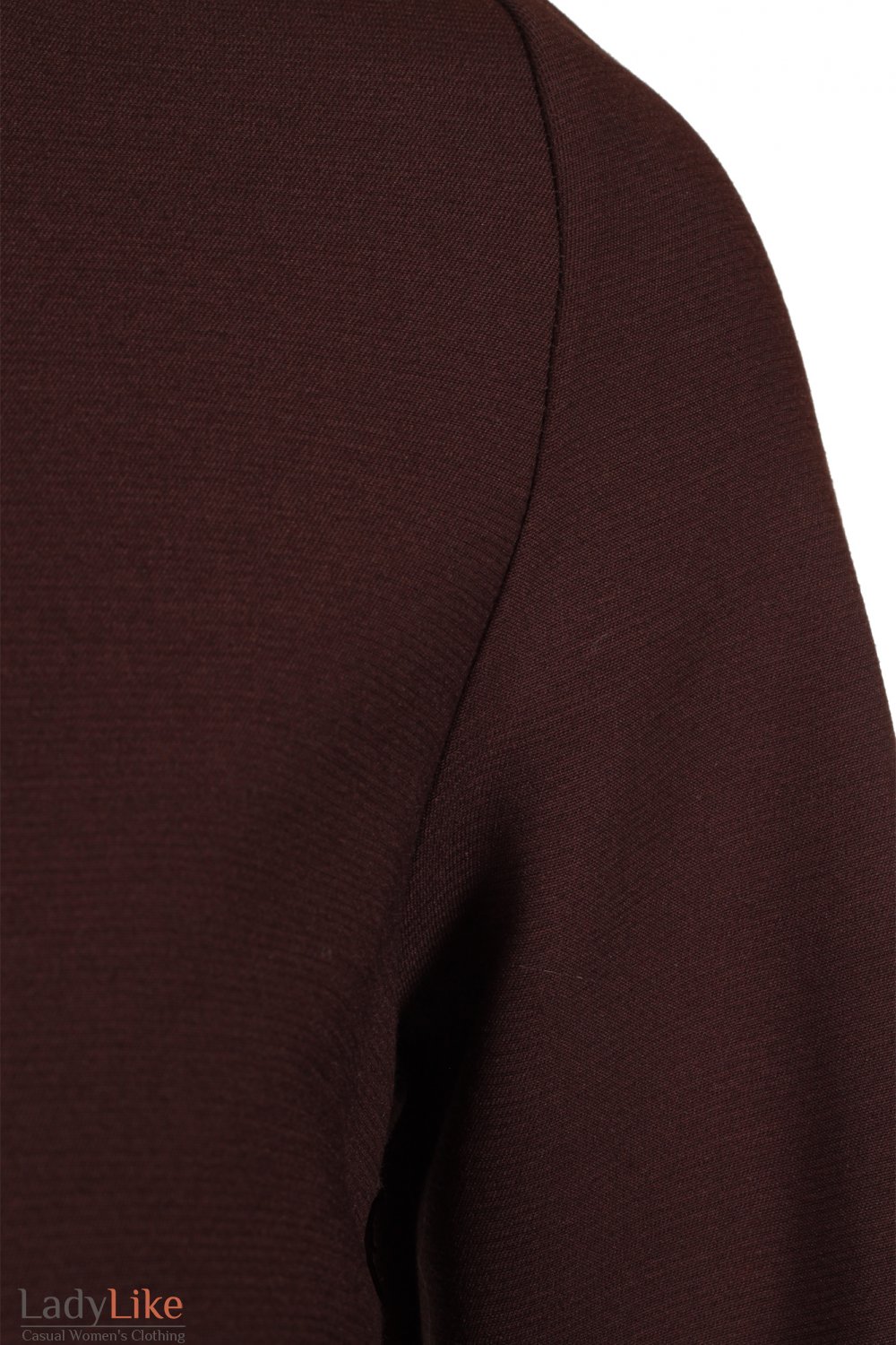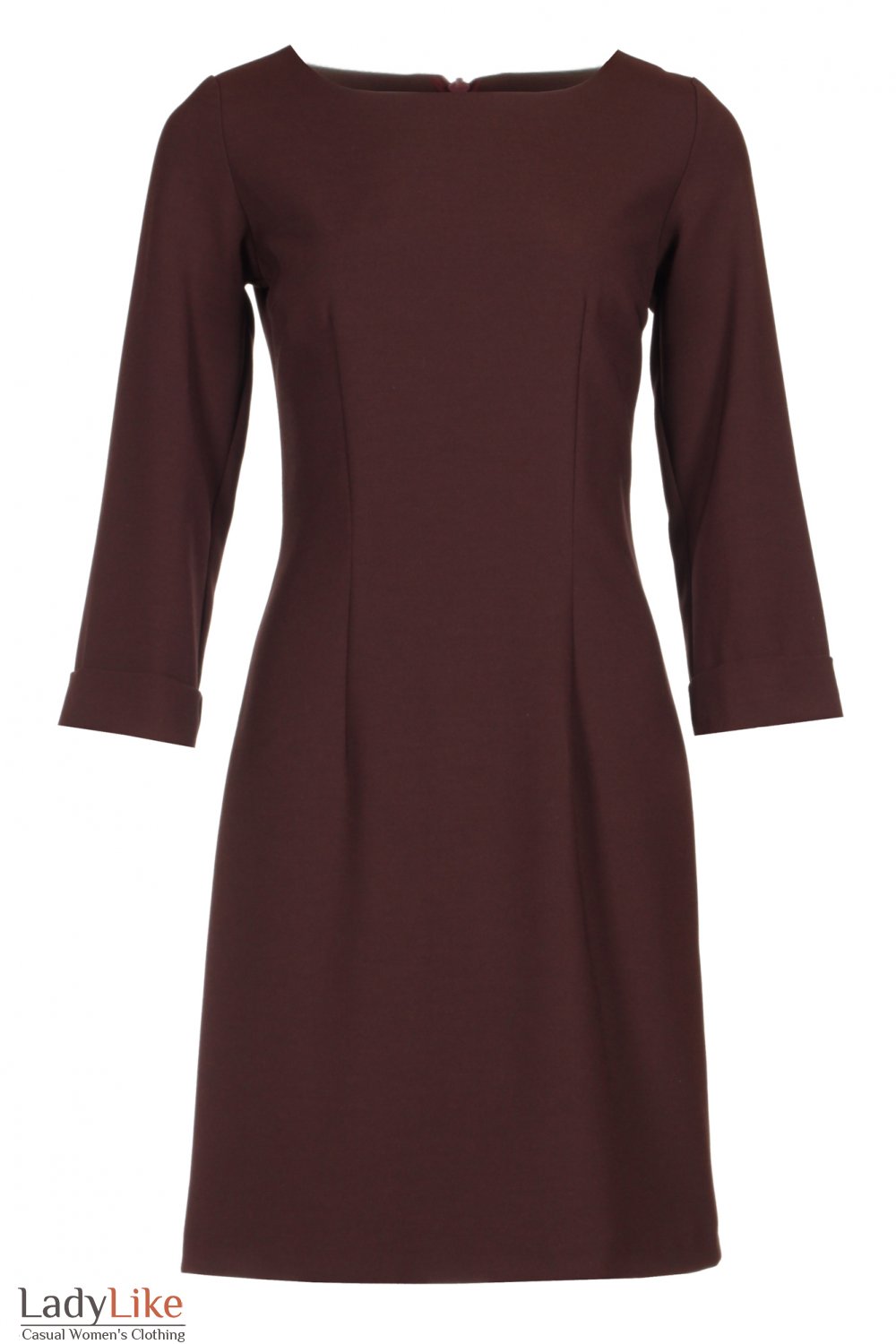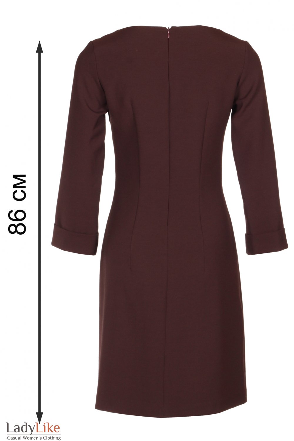 Сукня чохол міні, коричневого кольору з костюмної тканини. Прямий, приталений, круглий виріз горловини. Позаду застібається на блискавку. Рукави три чверті з манжетами. Довжина 86 см.