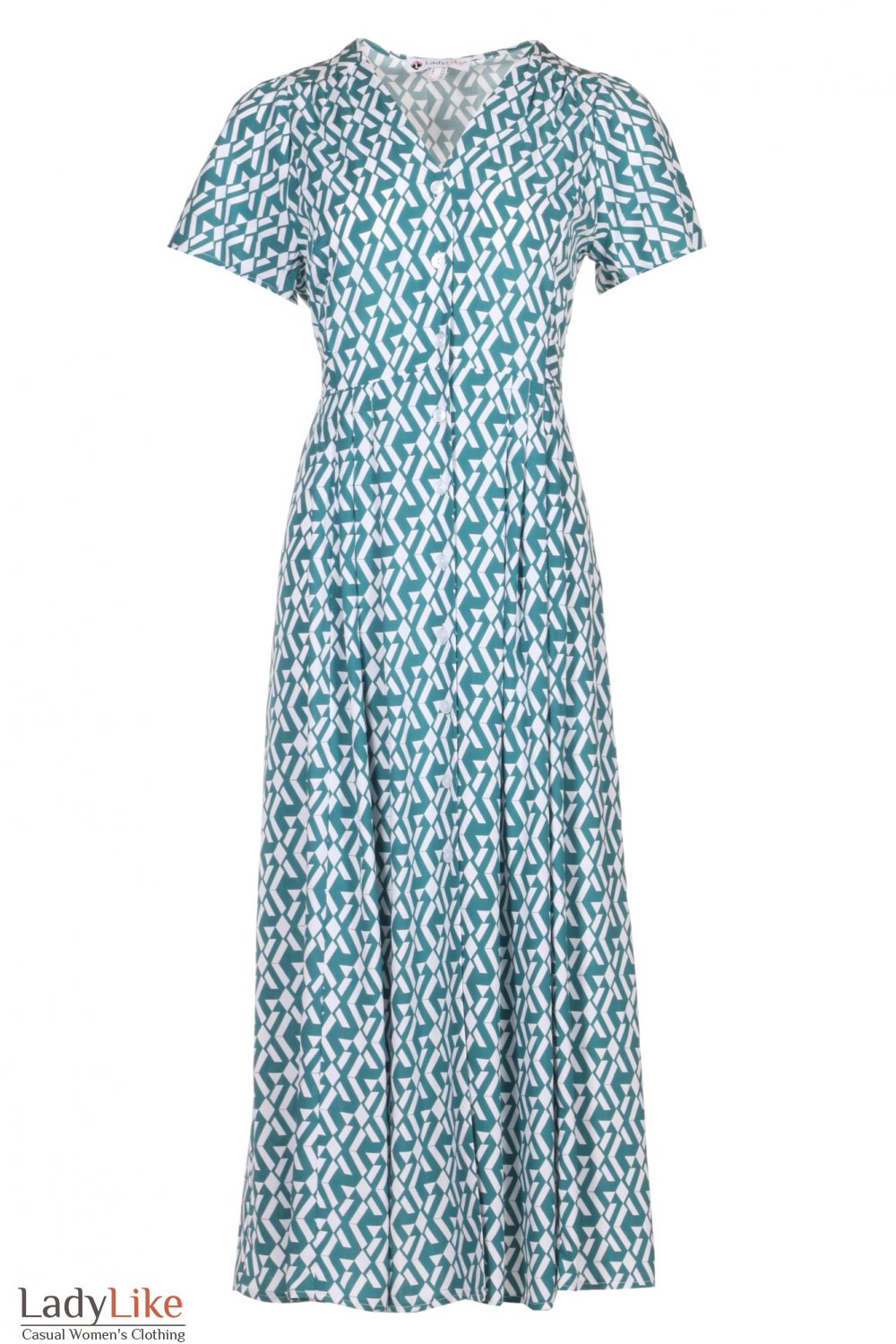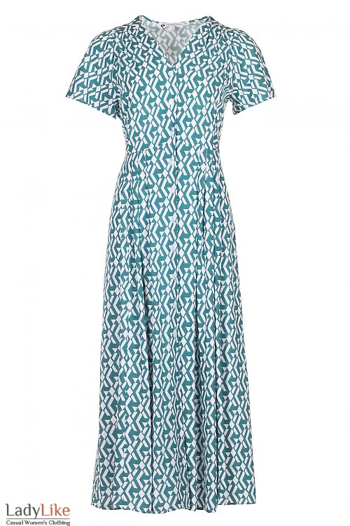 Сукня-халат штапельна в смарагдові та білі ромби. Прямого крою, на талії попереду та ззаду невеликі защипи. V-виріз горловини. Рукави короткі. Позаду зав'язується на поясок. Довжина 125см.