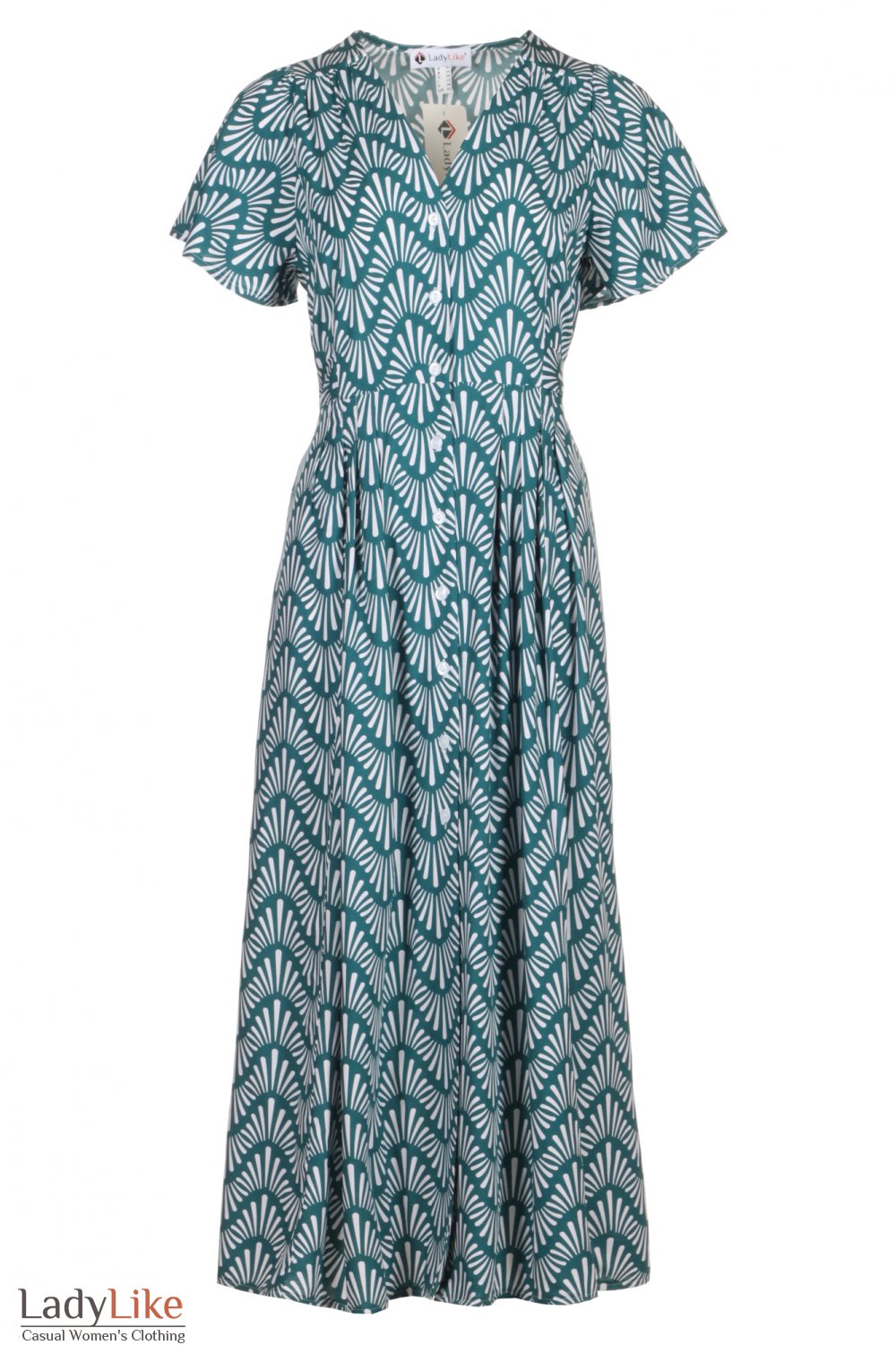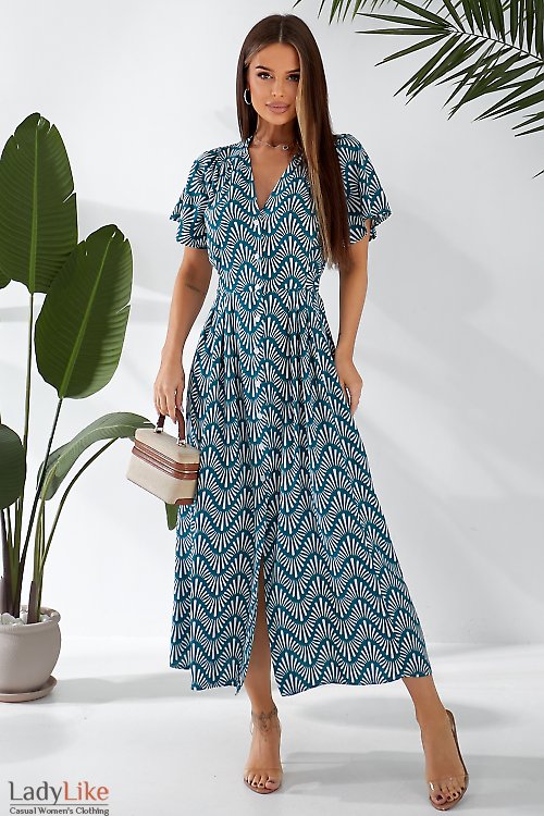 Сукня-халат смарагдовий колір у білий візерунок. Прямого крою, на талії попереду та ззаду невеликі защипи. V-виріз горловини. Рукави короткі. Позаду зав'язується на поясок. Довжина 123 см.