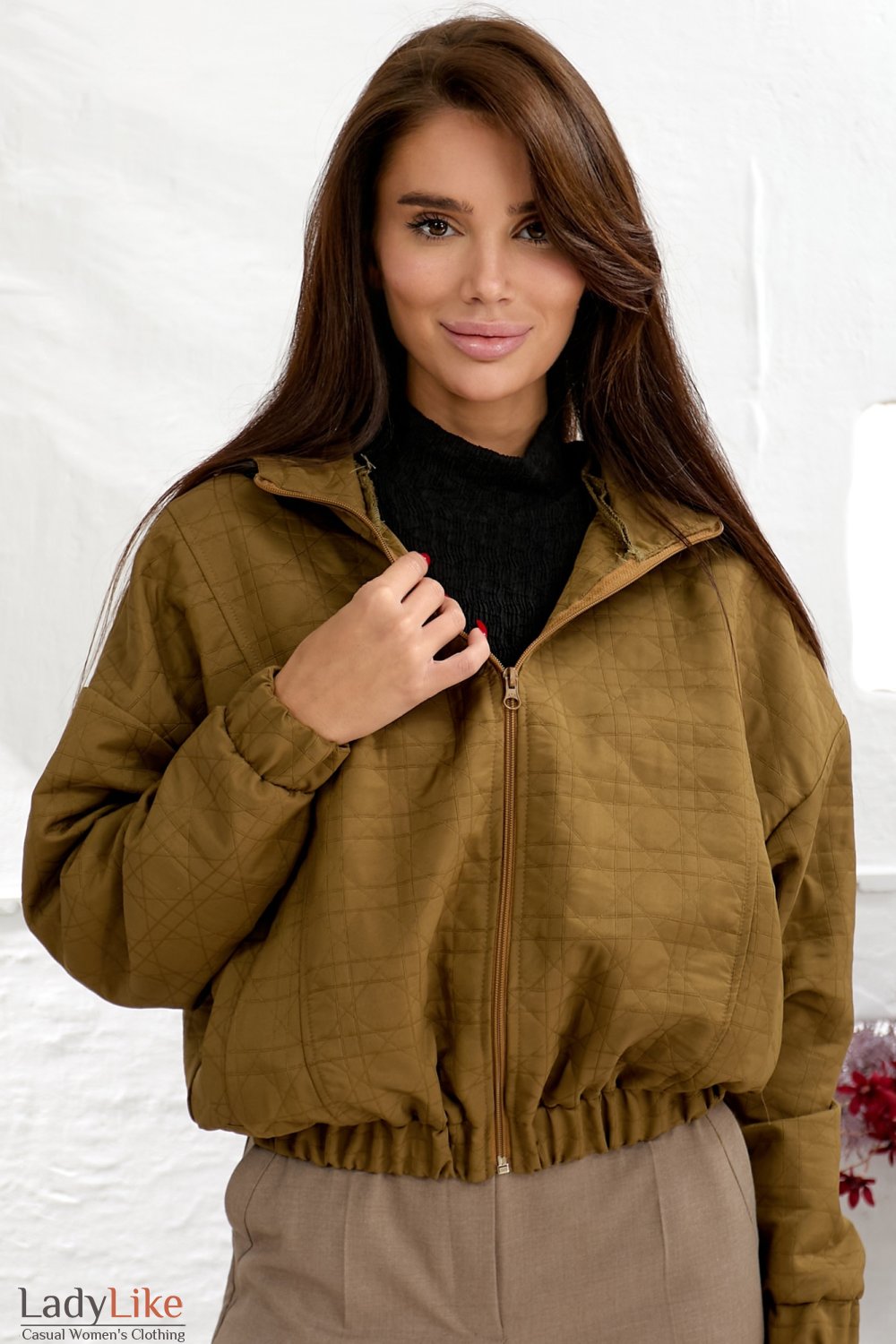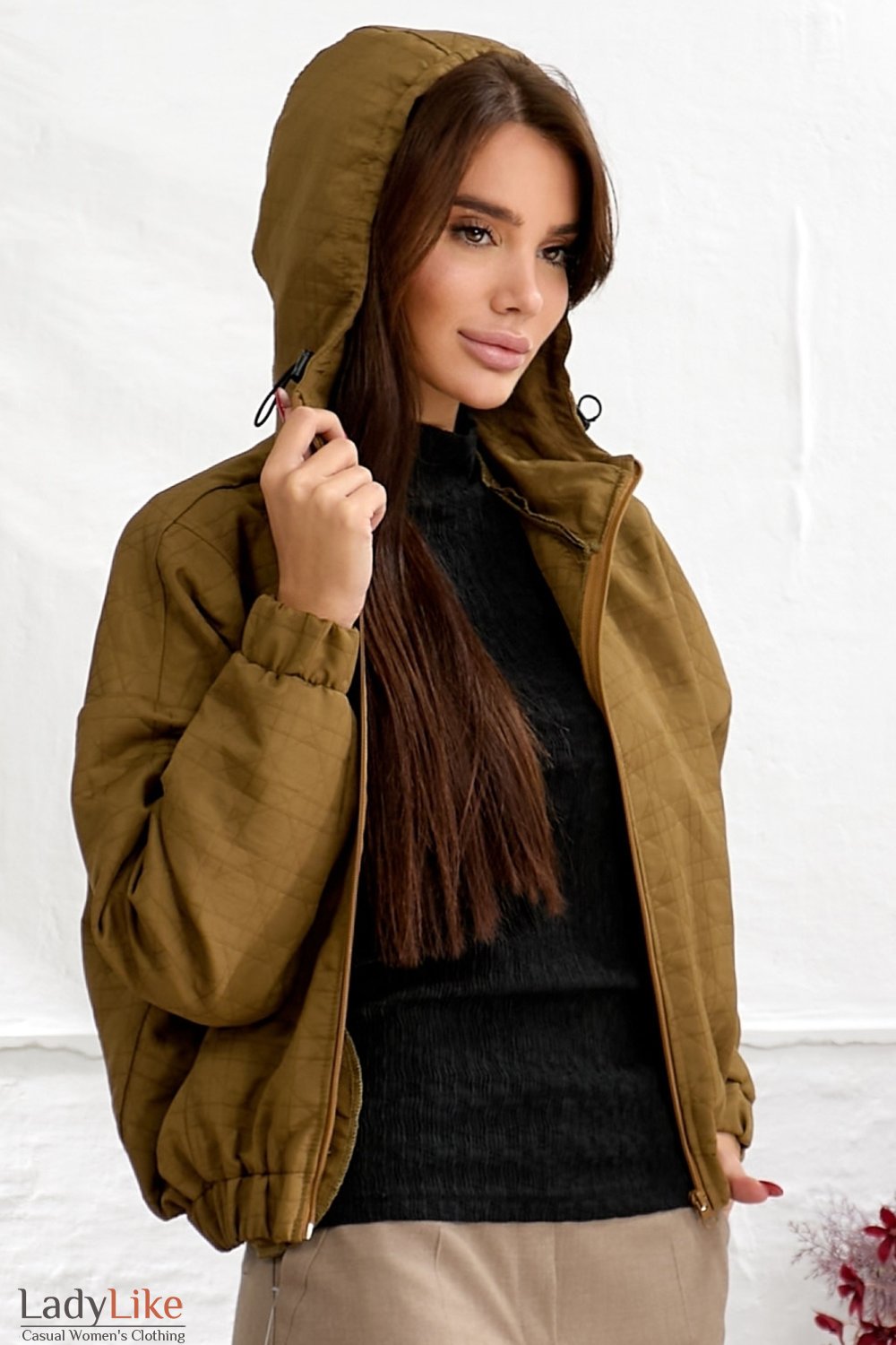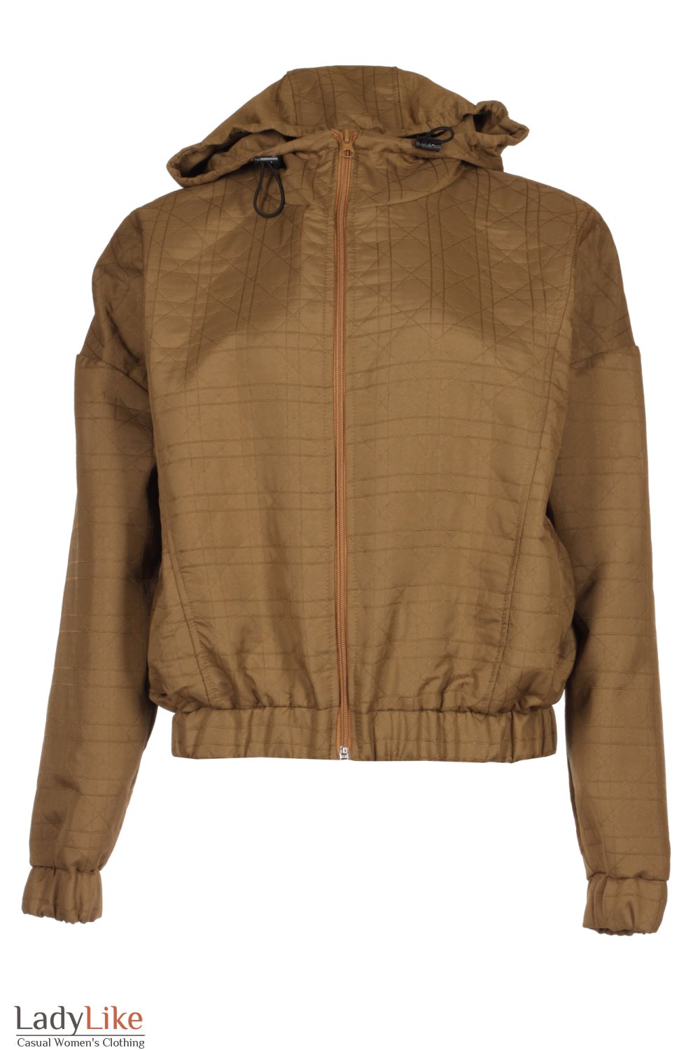 Куртка з капюшоном, колір хакі. Попереду застібається на блискавку. Рукави довгі, манжети на гумці. З боків кишені. Довжина 55см.