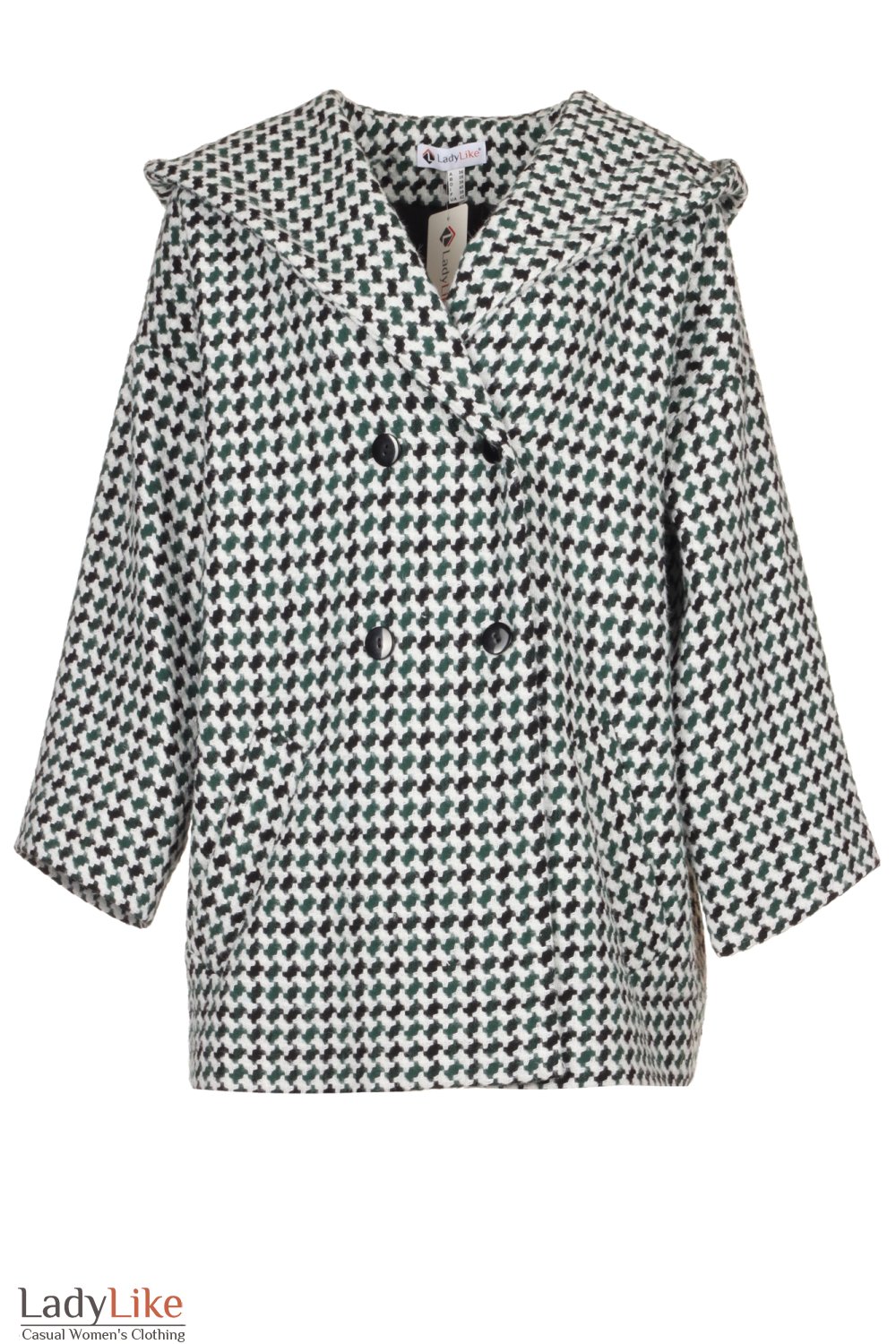 Двобортне пальто з підкладкою, білого кольору в чорно-зелений візерунок. Пряме, із широким капюшоном. Рукави довгі, попереду застібається на гудзики. З боків кишені. Довжина 76 см.